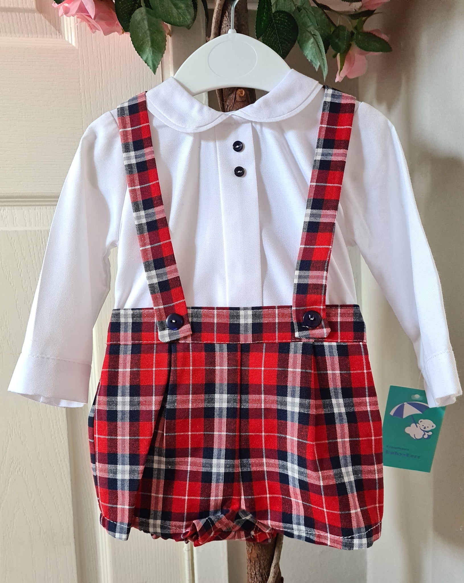 Beautiful Baby Boys red tartan shorts, matched with a white long sleeved shirt with back button fastening. These items are small on sizing, we recommend ordering a size larger.