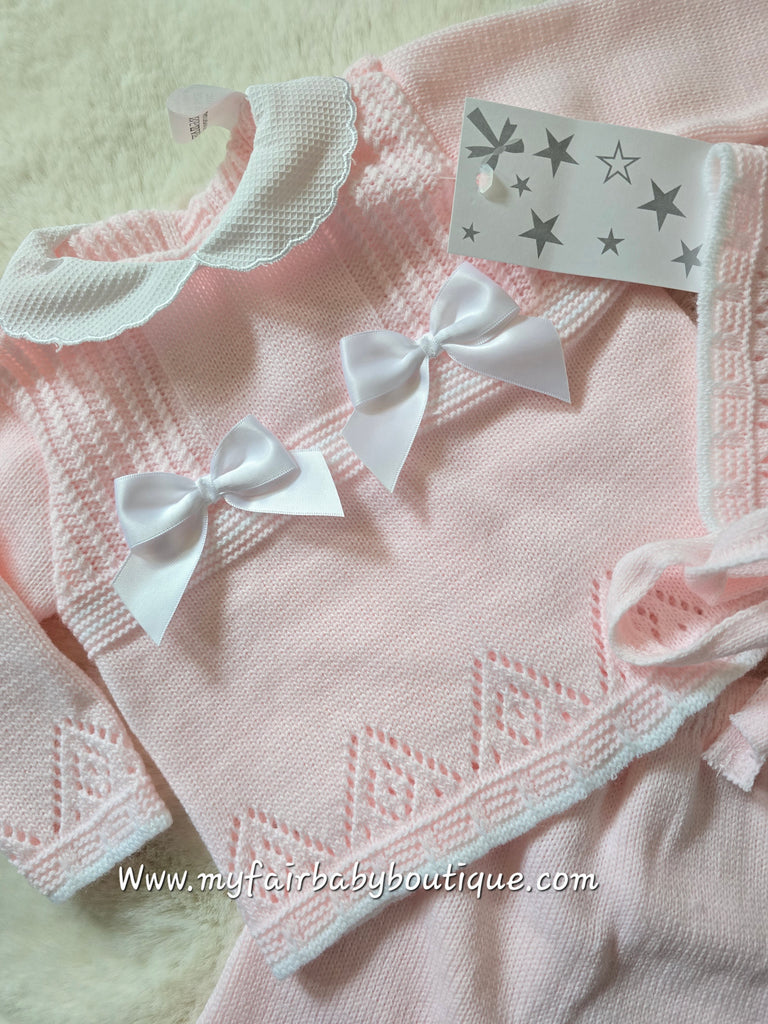 Spanish baby girls pink knitted jumper with a pique scalloped edge collar, a pretty open stitch design to the hem and cuffs, finished with two white chest bows. Matched with a pair of knitted trousers and a bonnet.