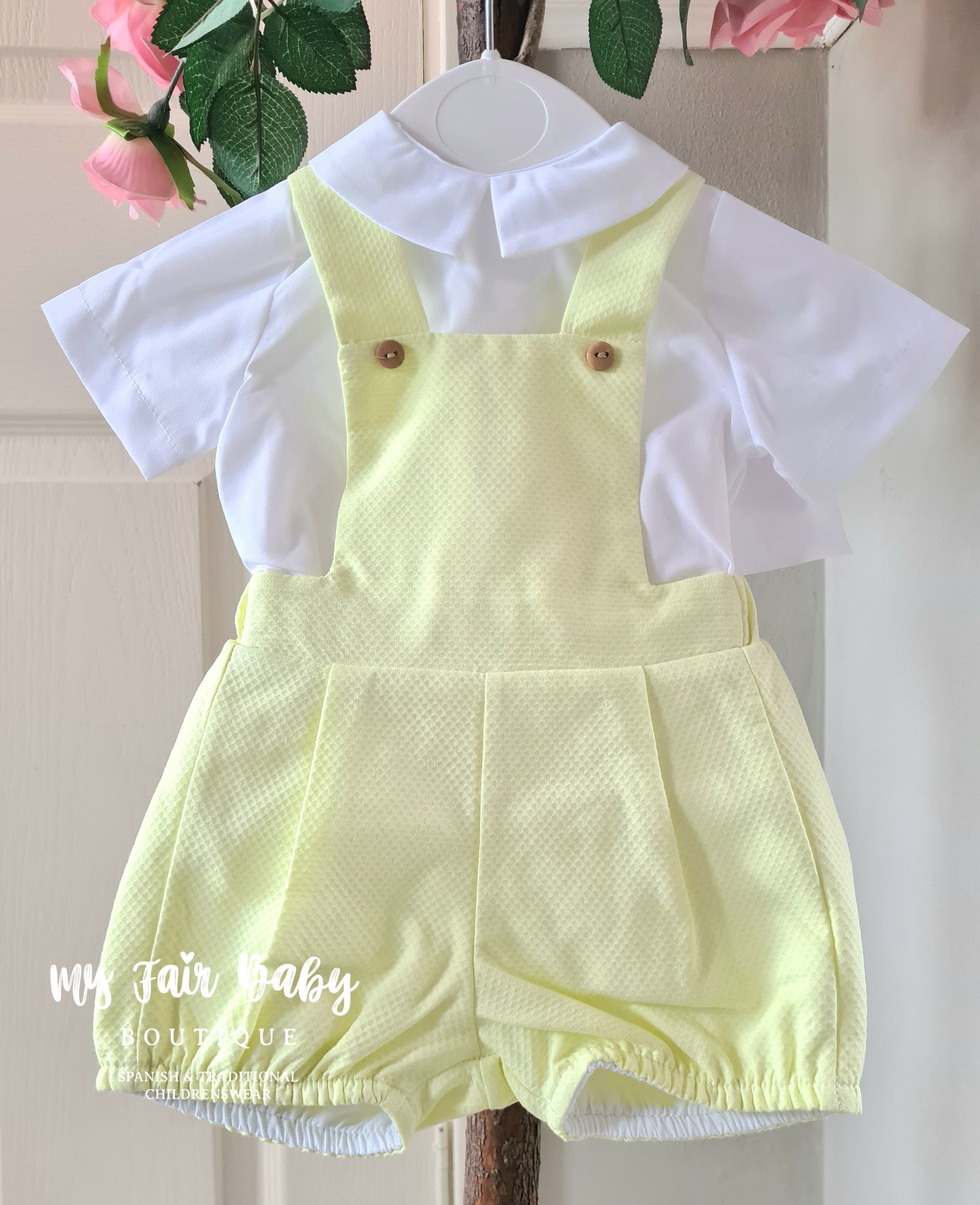 Spanish baby boys lemon waffle dungarees. Comprising of a pair of lemon waffle dungarees and a white cotton short sleeved shirt with back button fastening.