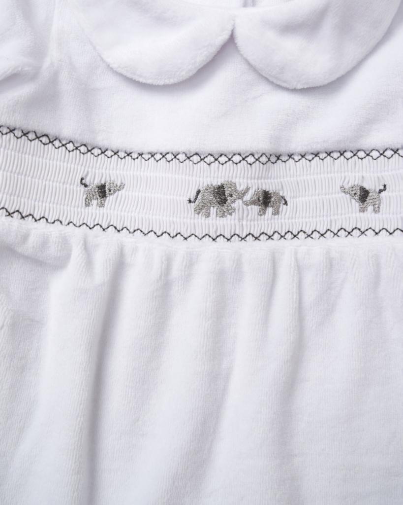 Traditional unisex baby white smocked elephant velour sleepsuit with popper fastening to the back and legs.