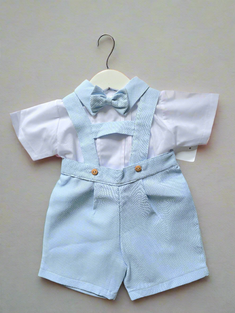 Spanish baby boys blue waffle h-bar dungarees 3pc. Comprising of a pair of blue waffle h-bar dungarees, a white short sleeved shirt with back button fastening, and a removable bow tie. This outfit is also available in navy, lemon and mint green.