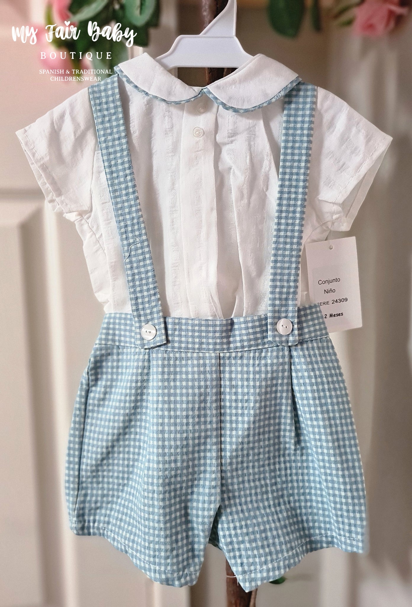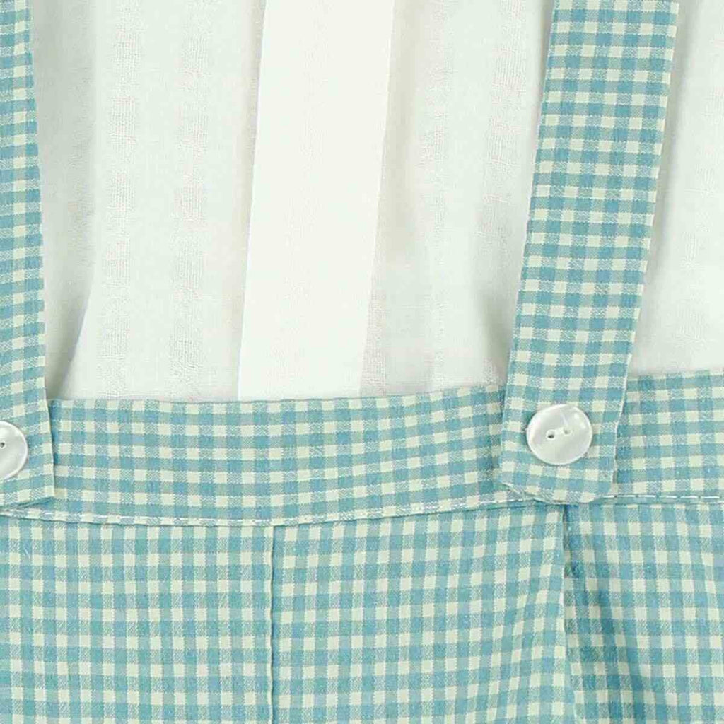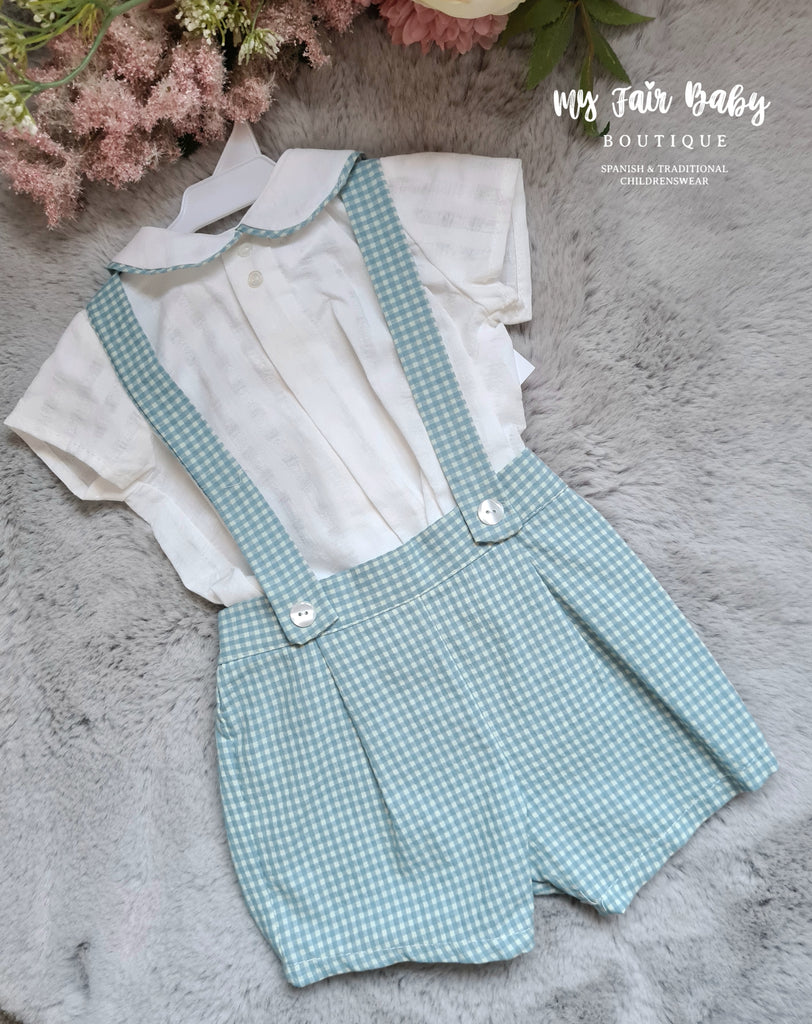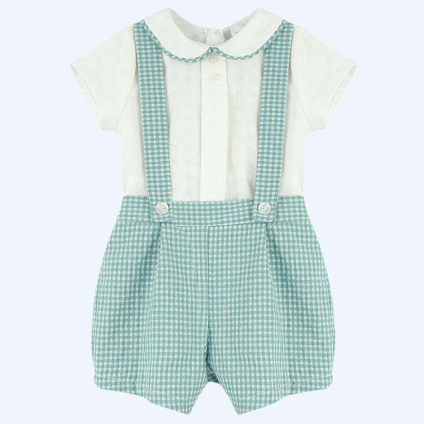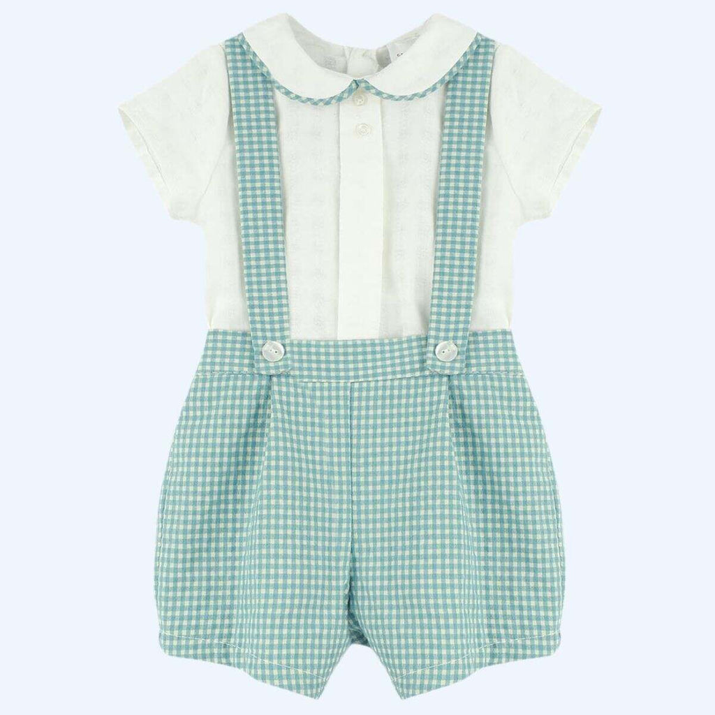 Spanish BabyFerr baby boys green gingham shorts with a matching short sleeved shirt. Matching baby boys romper and older girls dresses are available separately. Small on sizing.