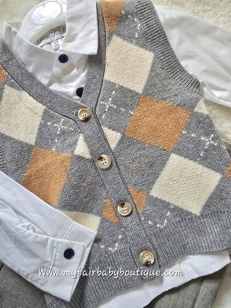 Beau kid traditional boys grey argyle tank top set. Comprising of a pair of grey trousers with an adjustable waistband. A grey and camel argyle tank top,  a long sleeved cotton shirt and matching flat cap. True to size fitting
