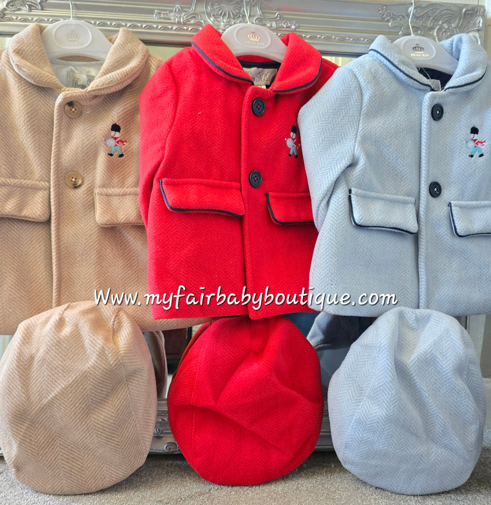 Beau Kid Baby Boys blue padded herringbone jacket with soldier motif and a matching flat cap set. True to size fitting. The matching romper is available separately. Other colours are also available.