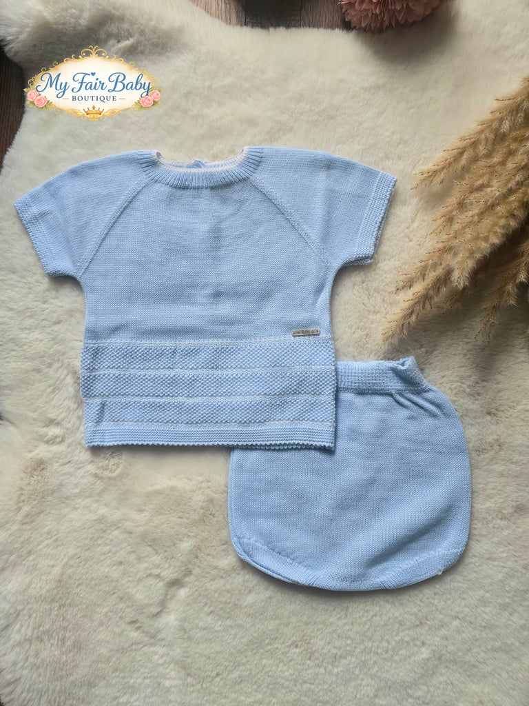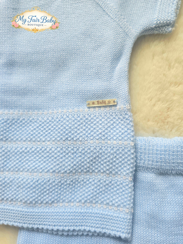 Spanish Baby boys blue fine knit jam pants set. A beautiful blue fine knit top with back button fastening, matched with a pair of knitted pants.