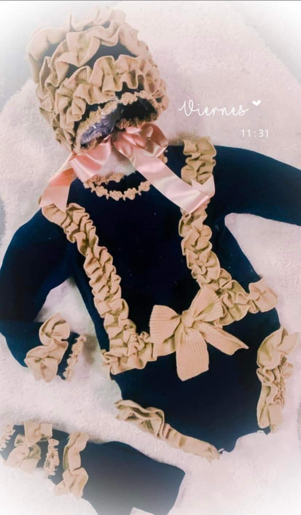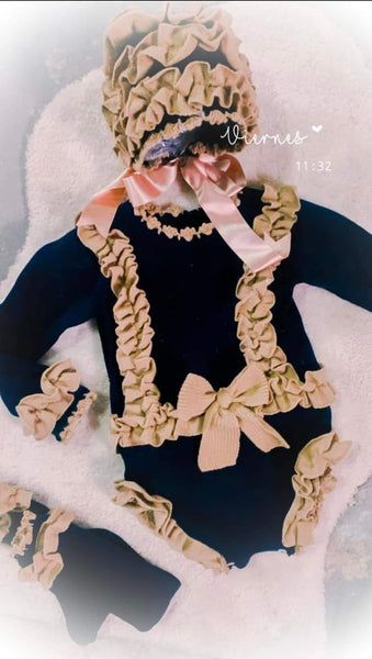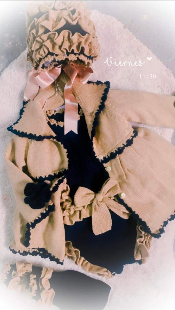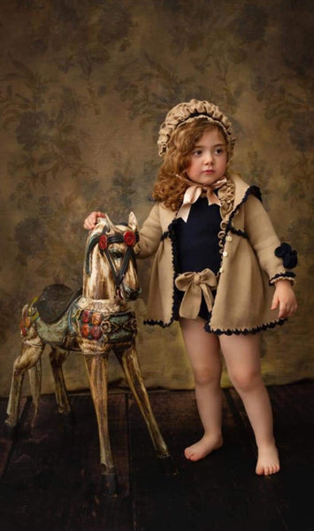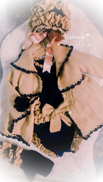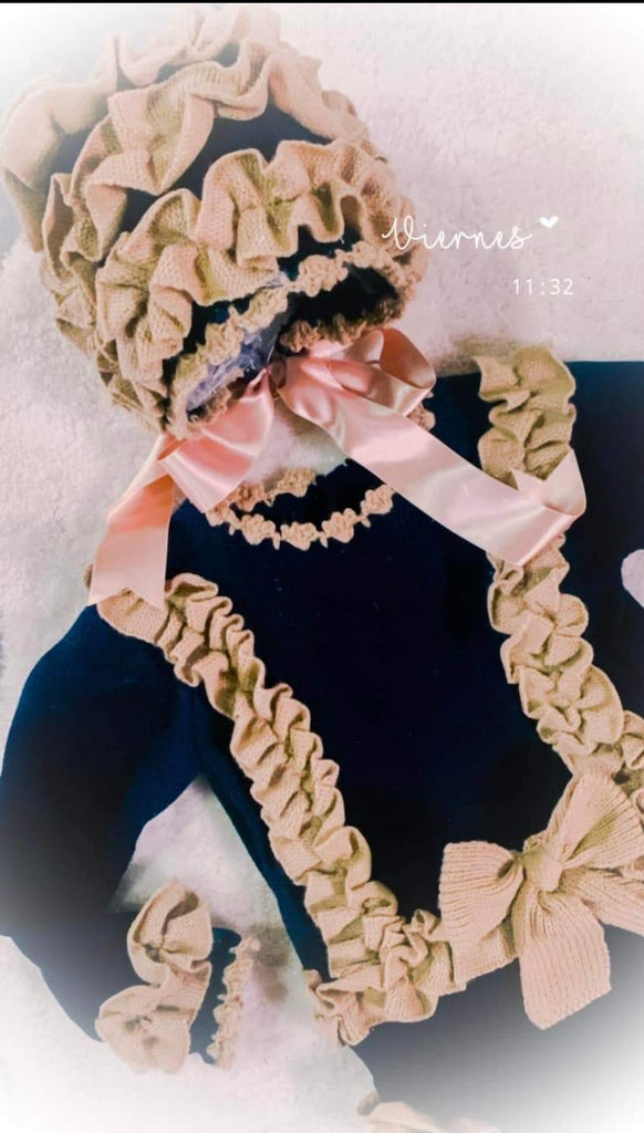 Ela Confeccion Spanish girls navy and camel knitted romper. The bonnet, socks and jacket are all available to order separately. These products are made to order and take approximately 6-8 weeks to arrive from the order date. Items which are made to order are exempt from a return as they are made only by customer request.