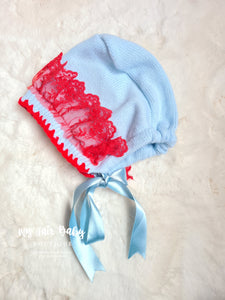 Ela Confeccion Spanish girls blue knitted bonnet with red lace trim. We have one 3y size in stock available to ship.