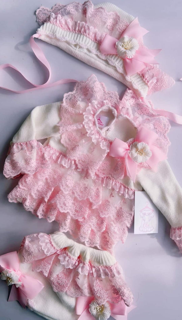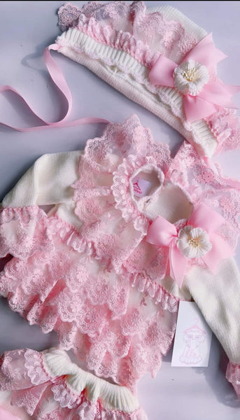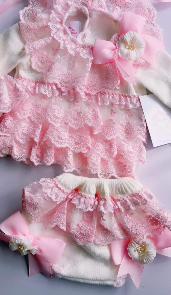 Ela Confeccion AW24 Spanish girls knitted jam pants set with pink lace trim. Includes pants, jumper and matching bonnet. True to size fitting. This product is made to order and takes approximately 6 weeks to arrive from the order date. Items which are made to order are exempt from a return as they are only ordered in by customer request. If you need any guidance on size, please ask before ordering.
