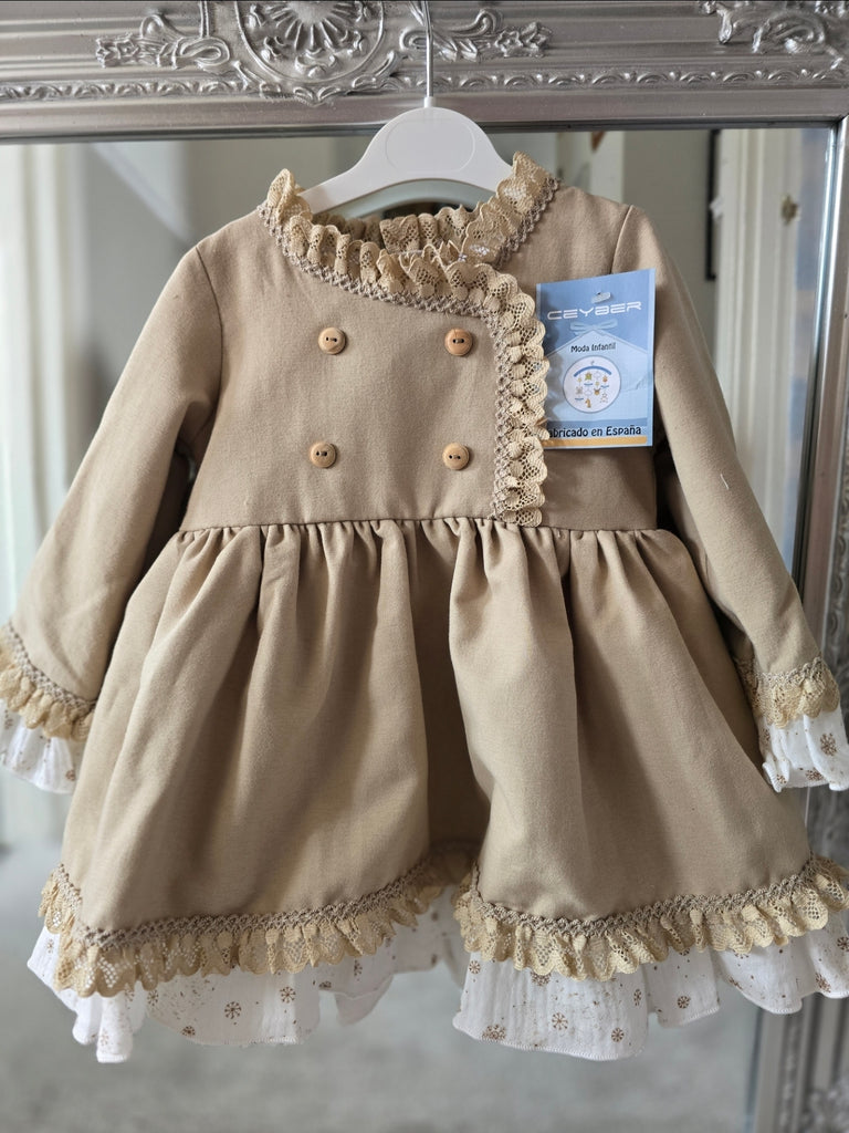 Ceyber Spanish girls camel and white long sleeved dress with lace trim. Matching pants are included with ages 12m, 18m & 24m only.