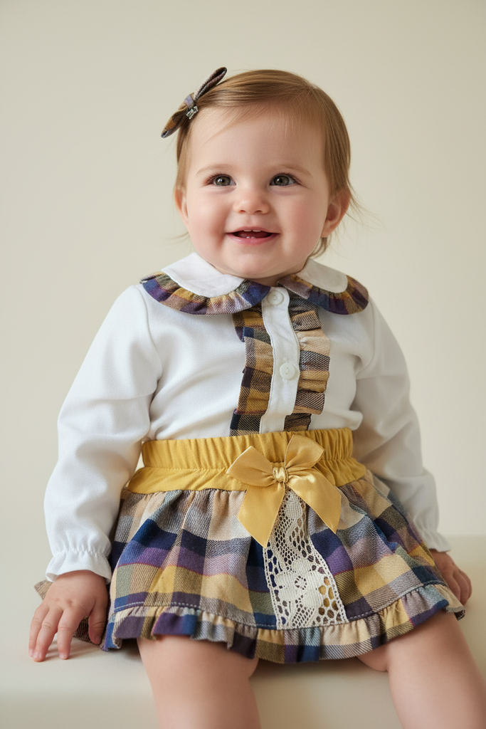 Spanish baby girls mustard check jam pants with lace & bow detailing. Matched with a cream long sleeved blouse with coordinating trim.