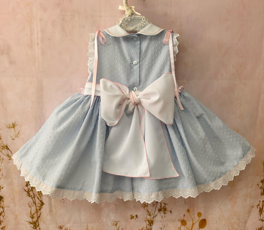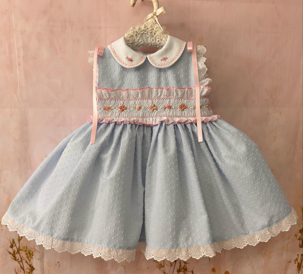 Sonata Infantil traditional Spanish girls blue & pink smocked plumeti puffball dress. True to size fitting. This product is made to order and will take approximately 6 weeks to arrive from the order date. Kindly note items which are 'Made to order' are exempt from a return, as they are ordered in by customer request only.