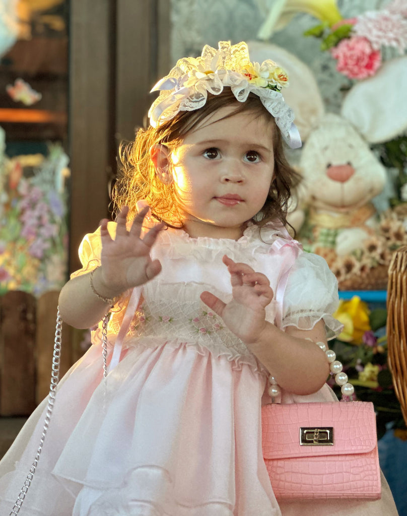 Sonata Infantil traditional Spanish girls pink roses smocked puffball dress. True to size fitting. The matching bag, headband and socks aren't included, but are all available to order separately. This product is made to order and will take approximately 6 weeks to arrive from the order date. Kindly note items which are 'Made to order' are exempt from a return, as they are ordered in by customer request only.