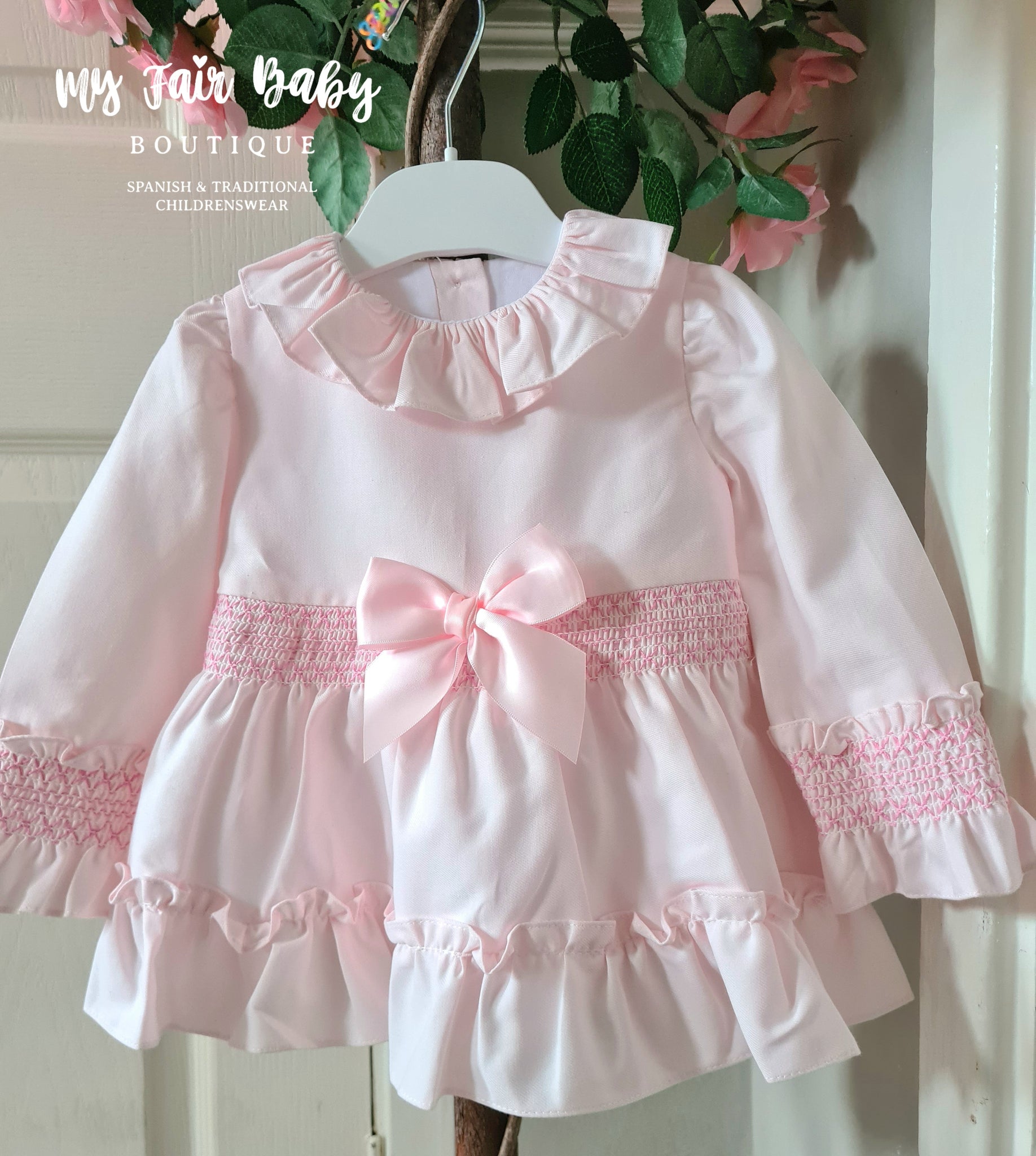 Spanish baby girls pink long sleeved winter dress with frilly collar and smocking to the chest and cuffs. True to size fitting.