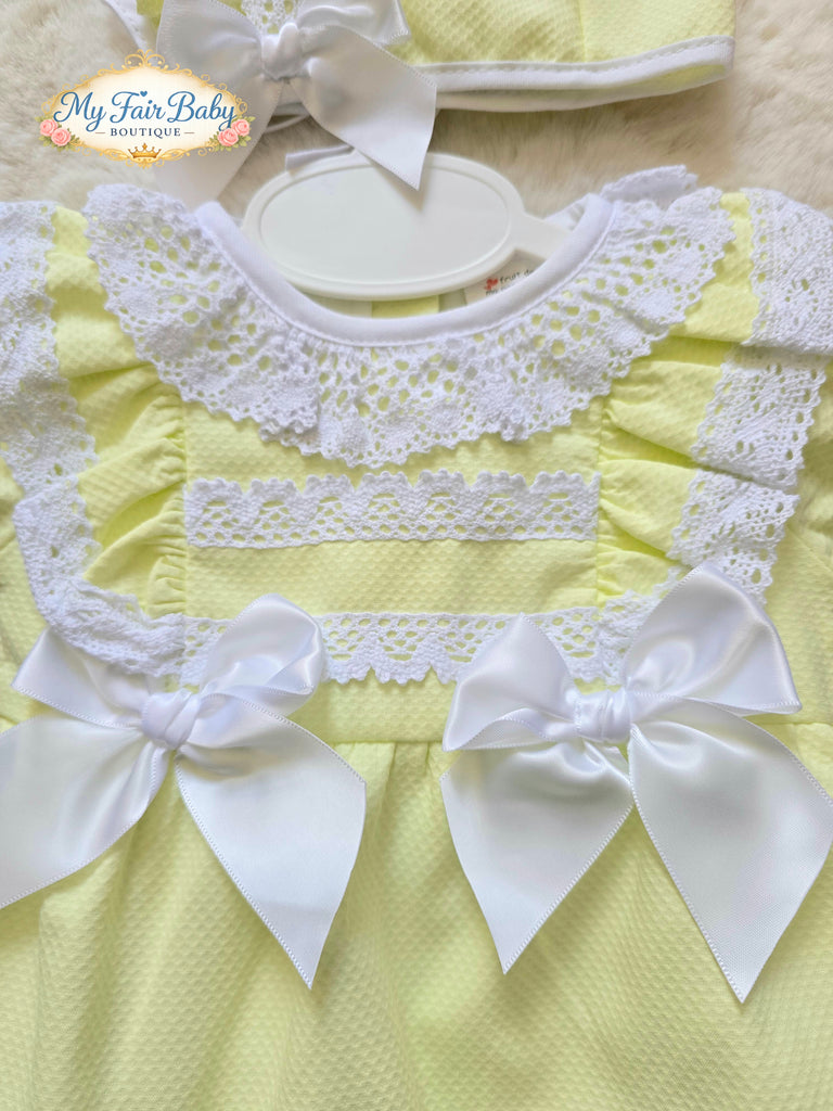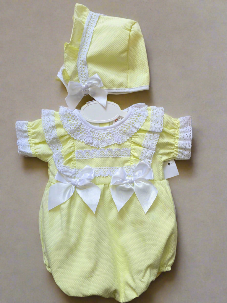 Spanish baby girls lemon waffle romper & bonnet set. Comprising of a lemon waffle romper with white lace trim and double satin chest bows. Complete with a matching bonnet. The outfit is 100% cotton and the romper is fully lined.