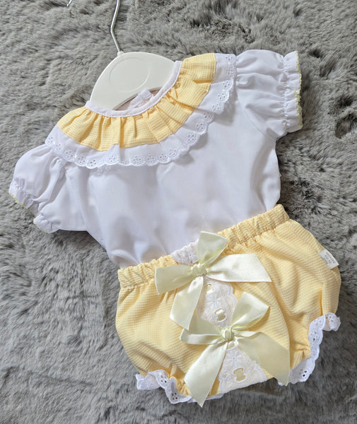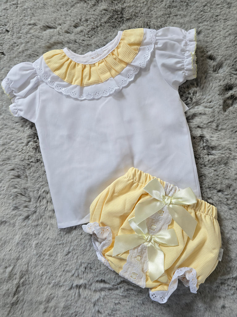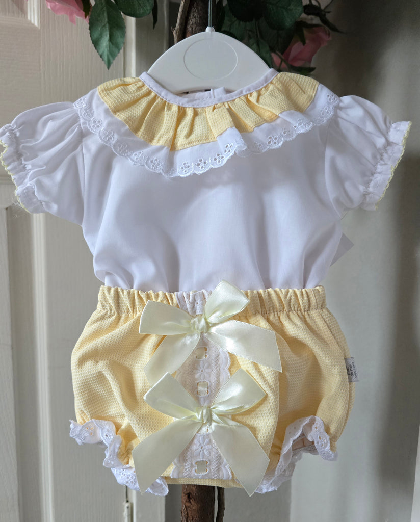 Spanish Baby Girls lemon waffle jam pants with a front ribbon slot panel and double silk bows. Paired with a white short sleeved shirt with coordinating lemon collar. Small on sizing.
