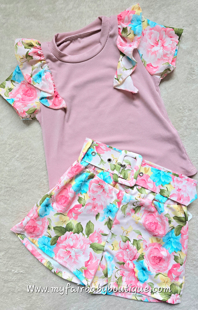 Girls Dusky Pink top with ruffles and a pair of floral shorts with a detachable belt.