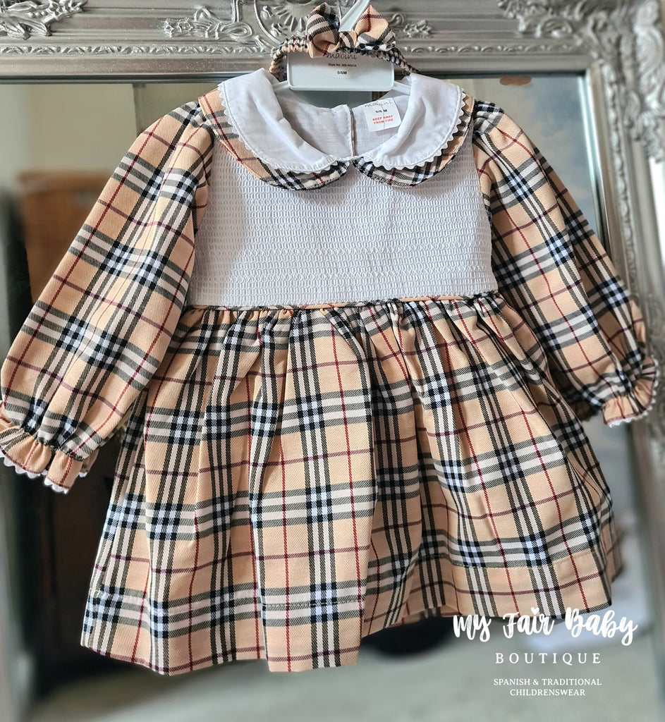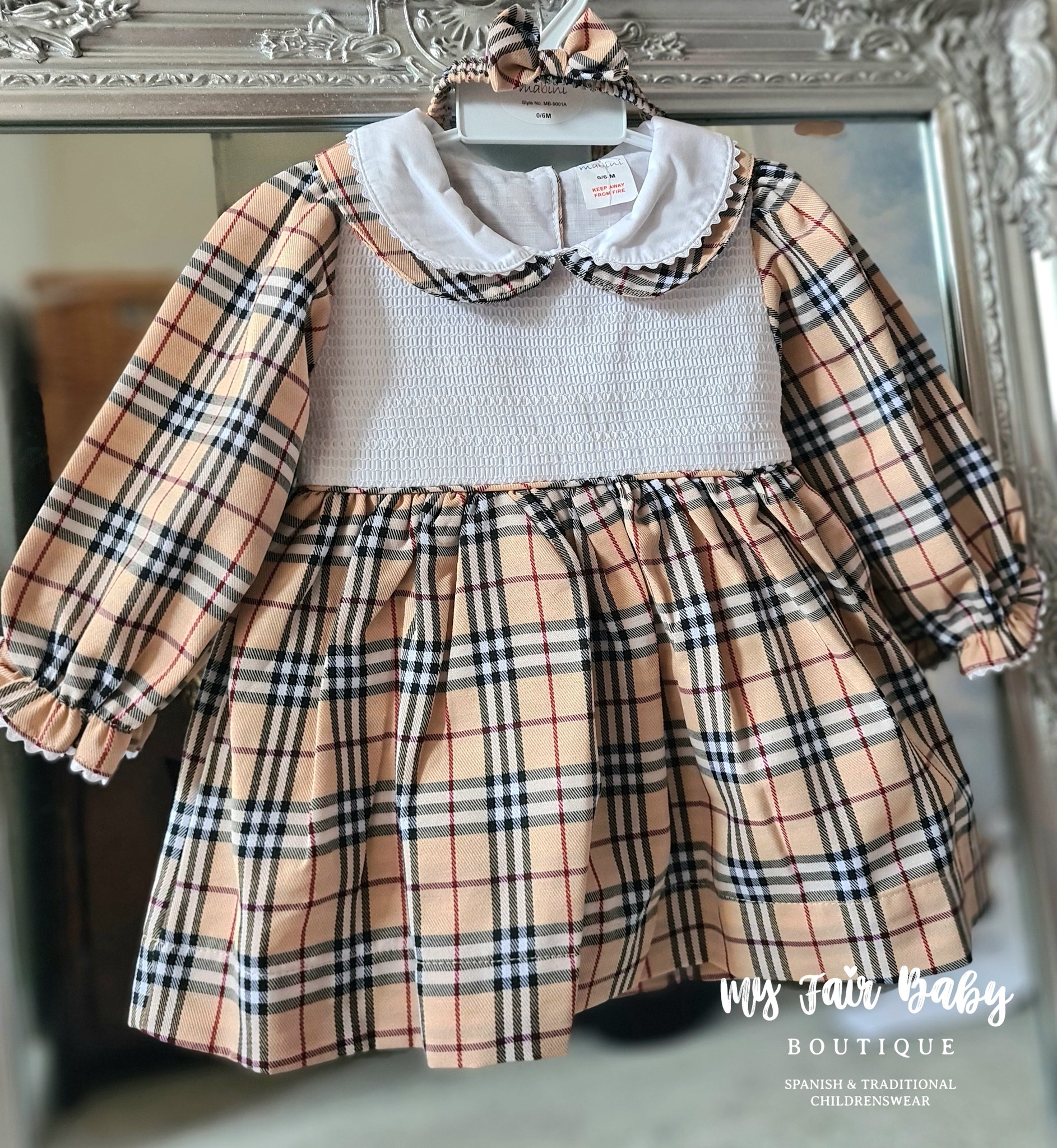 Traditional girls long sleeved beige tartan dress with smocking to the chest. A headband is included with all sizes. Sizes 0-2y includes pants. True to size fitting. Matching boys sets are available seperately.