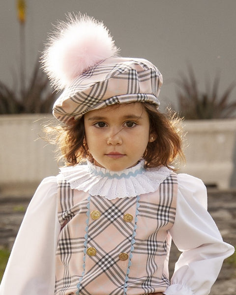 This item is made to order and takes approximately 8 weeks to arrive from the order date (if you need the item sooner please message us to discuss this). Spanish girls pink tartan short set with blouse by Sonata Infantil. The matching beret is not included but is available to purchase separately here.