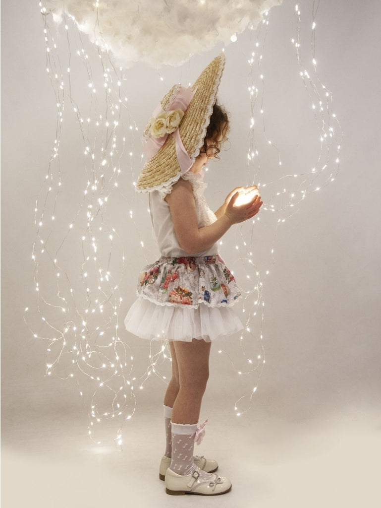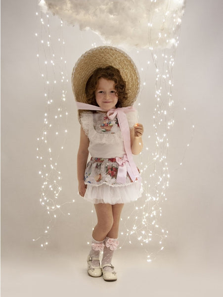 Sonata lnfantil Spanish girls white frilly blouse with lace trim and matching Easter skirt with tulle hem and satin bow. True to size fitting. This item is made to order and takes approximately 6-8 weeks to arrive from the order date. Matching Easter dress also available here. Kindly note items which are 'made to order' are exempt from a return as they are ordered in by customer request. If you need measurements, please contact us before ordering.