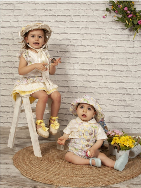 Sonata Infantil Spanish girls Easter skort & blouse set. True to size fitting. This product is made to order and takes approximately 6-8 weeks to arrive from the order date. A matching dress is available here and matching boys set is available here. Kindly note items which are 'made to order' are exempt from a return as they are ordered in by customer request. If you need measurements, please contact us before ordering.