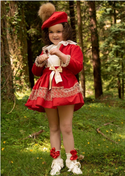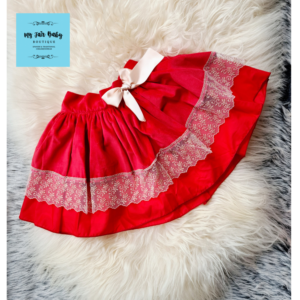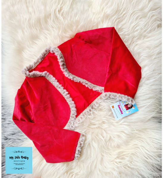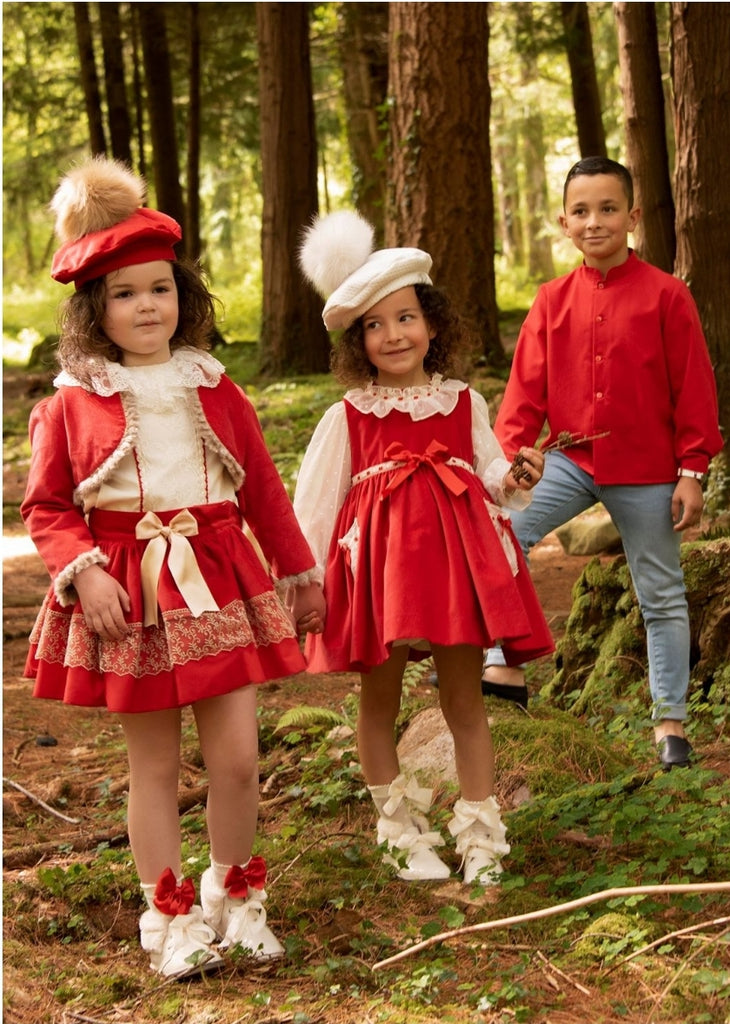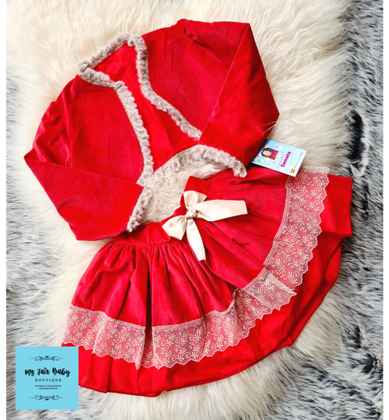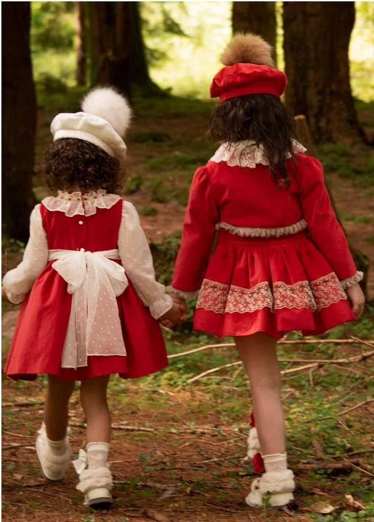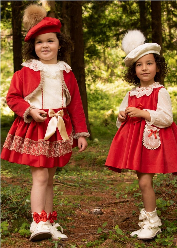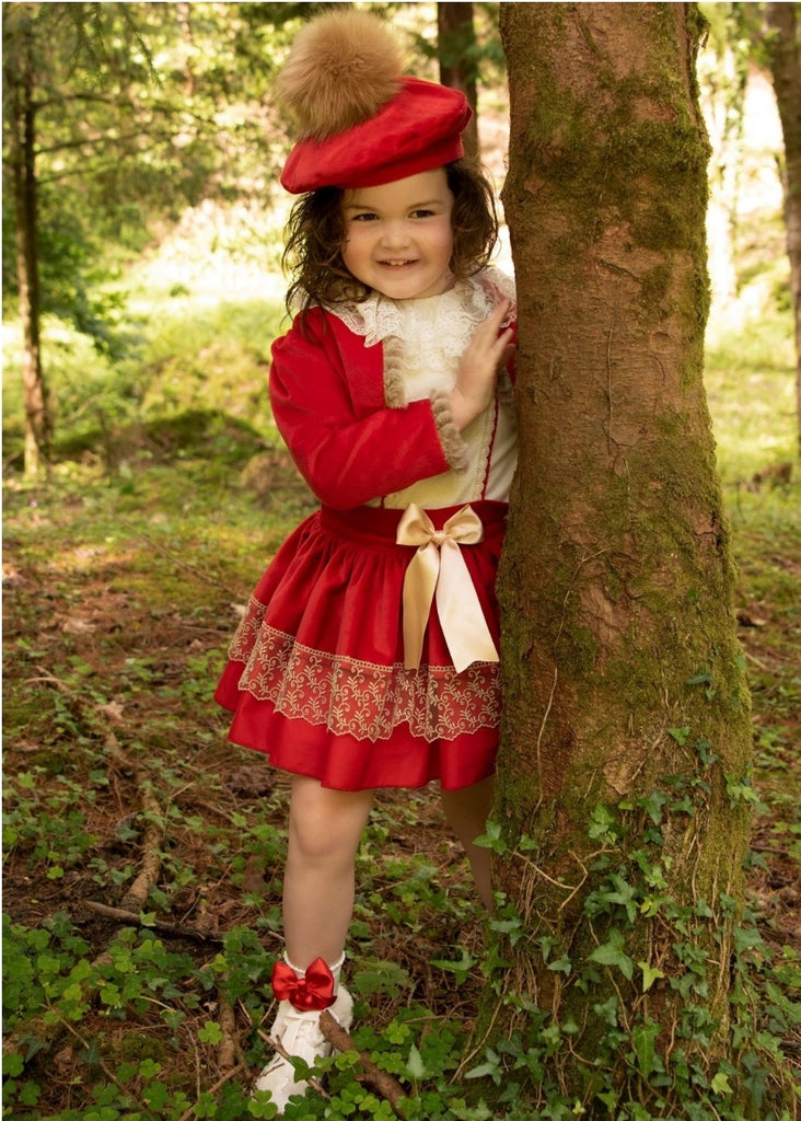 Sonata Infantil Spanish Girls red velvet Paulette skirt & jacket set. The blouse and hat are not included but can be ordered separately.   True to size fittingThis product is made to order and will take approximately 6 weeks to arrive from the order date. Kindly note items which are 'Made to order' are exempt from a return, as they are ordered in by customer request only.
