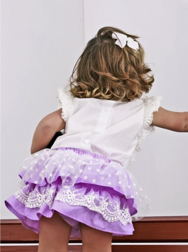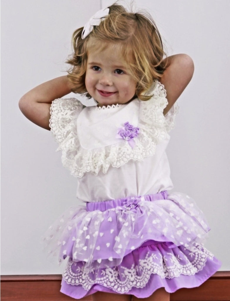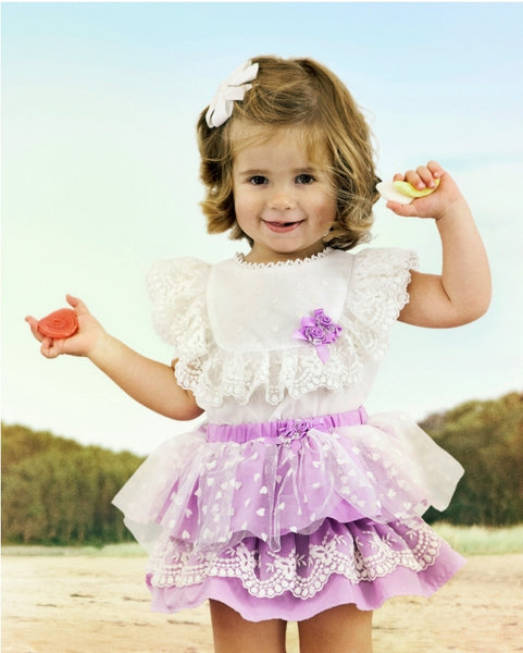 Sonata Infantil Spanish girls lilac tulle heart skirt, matched with a white lace trimmed sleeveless blouse. This product is available in pink and red. True to size fitting. This item is made to order and takes approximately 8 weeks to arrive from the order date. Kindly note items which are 'made to order' are exempt from a return as they are ordered in by customer request. If you need measurements, please contact us before ordering.