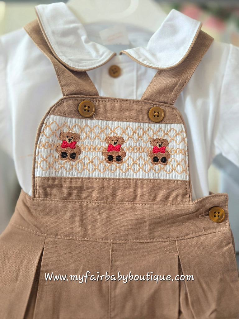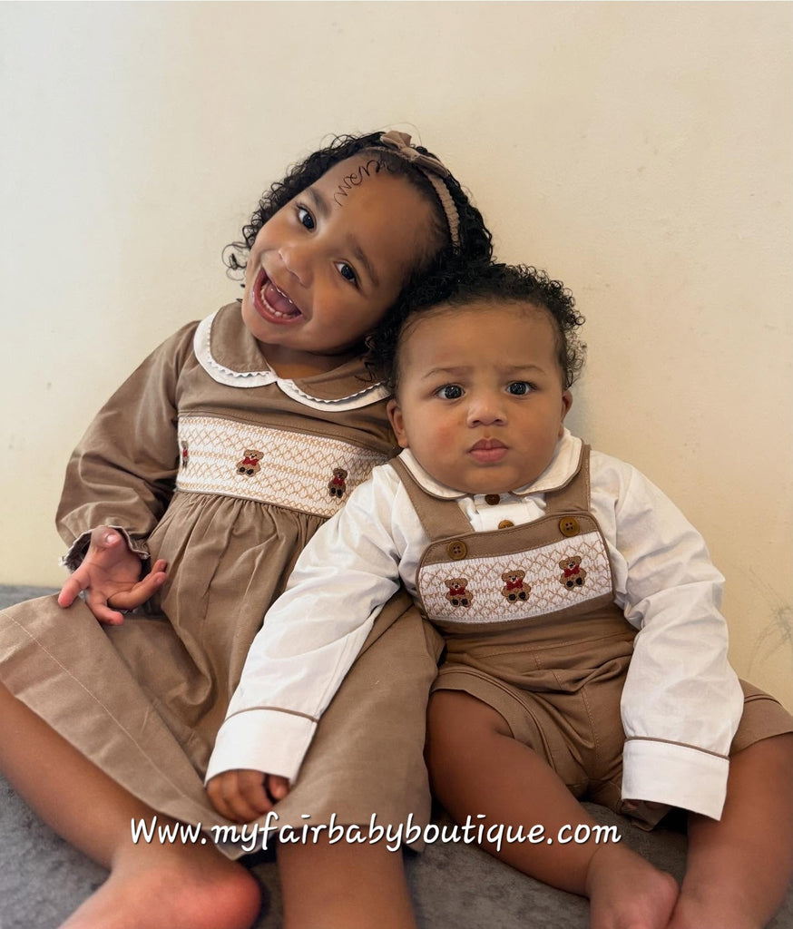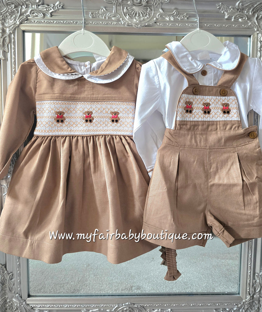 Mabini baby traditional spanish boys chocolate smocked teddy bear dungarees with matching shirt. The matching girls dresses are available separately.