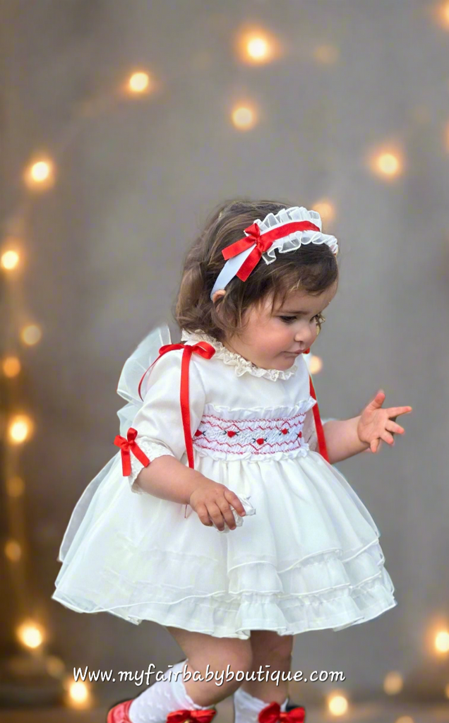 Sonata Infantil AW25 Spanish Girls ivory & red organza smocked Puffball Dress. True to size fitting. The matching headband and socks are available separately. Order by the 5th November for guaranteed xmas delivery!  This item is made to order and takes approximately 8 weeks to arrive from the order date. Kindly note items which are ' made to order' are exempt from a return as they are ordered in by customer request. If you need measurements, please message us before ordering.