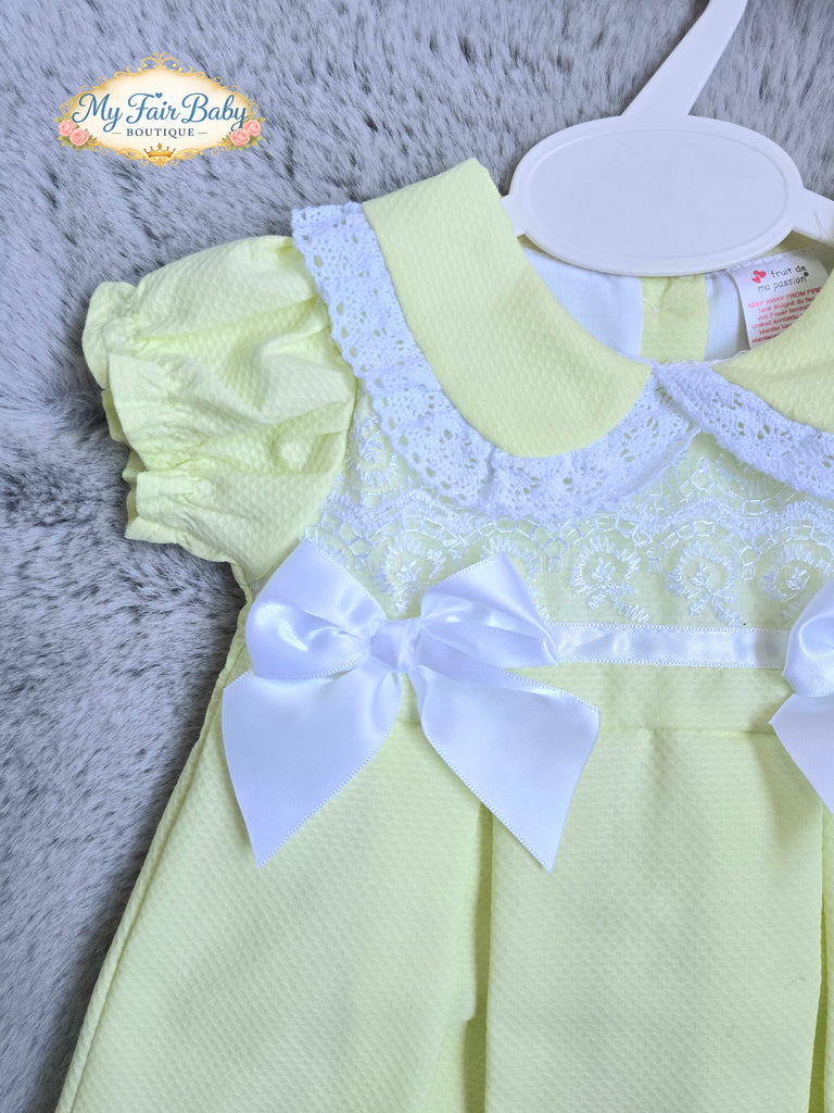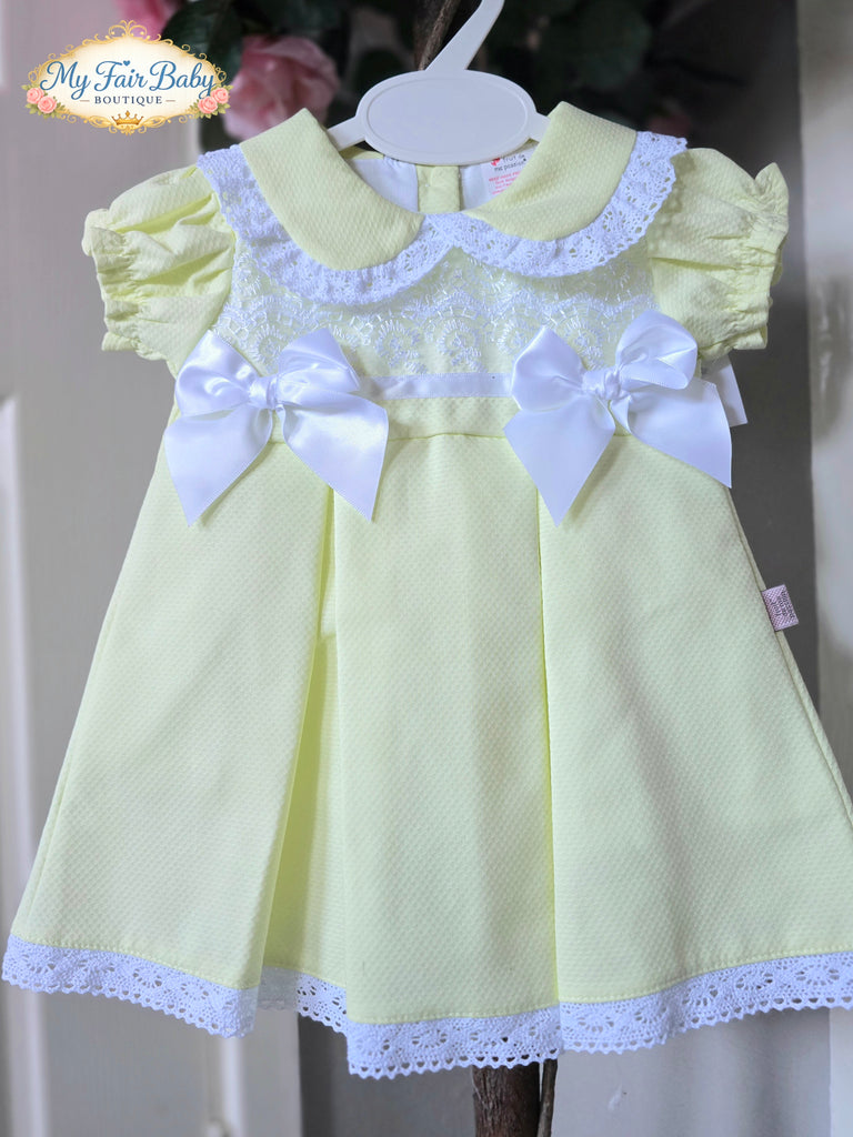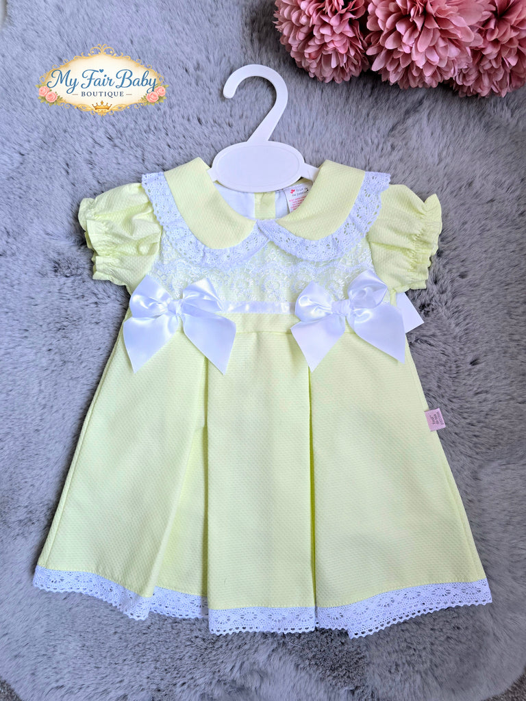 Spanish baby girls lemon pique pleated dress with white lace and bow detailing. Button fastening to the back.