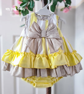 Ceyber Spanish baby girls yellow & tan ruffled dress with a large chest bow. Matching pants included. Small on sizing. Matching older girls dress available separately.