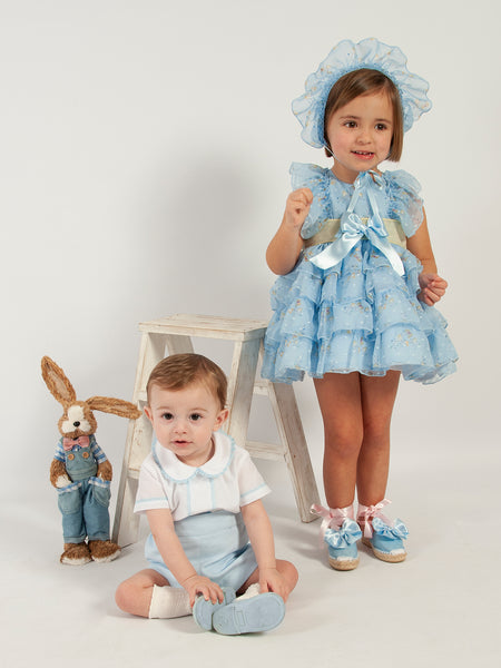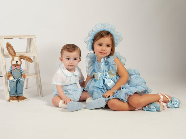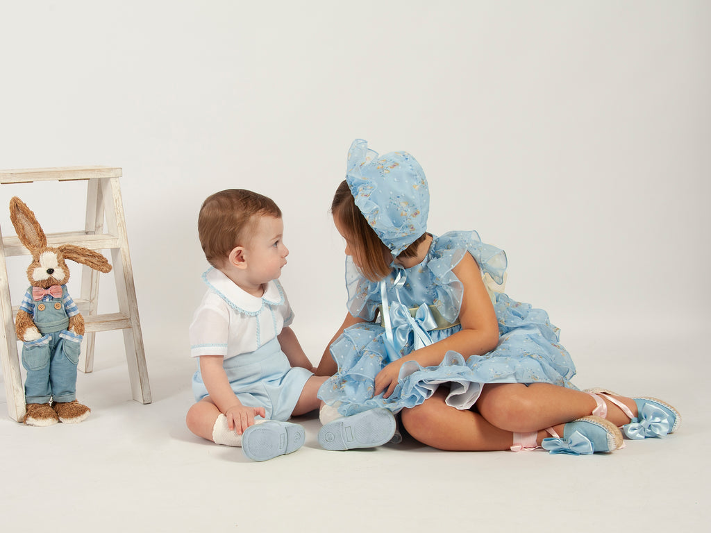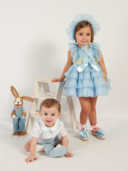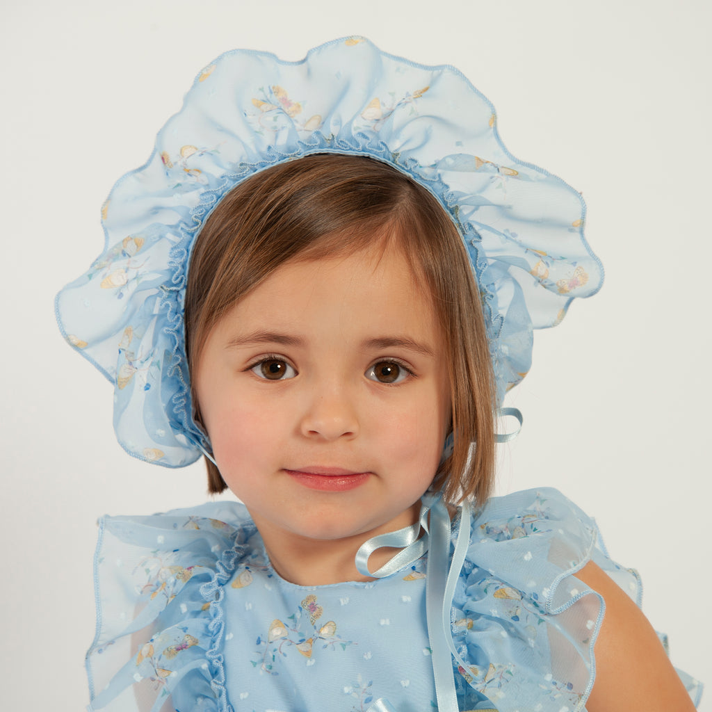Sonata Infantil traditional Spanish girls blue tulle puffball dress with optional bonnet to match. True to size fitting. Matching boys sets are available seperately. This product is made to order and will take approximately 6 weeks to arrive from the order date. Kindly note items which are 'Made to order' are exempt from a return, as they are ordered in by customer request. If you need measurements before ordering, please send us a message via email, or contact us on Facebook My Fair Baby Boutique - Home | Facebook or Instagram @my_fair_baby_boutique