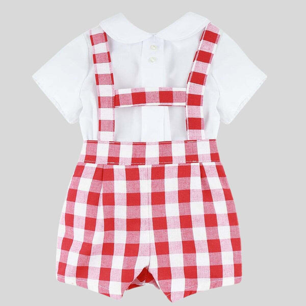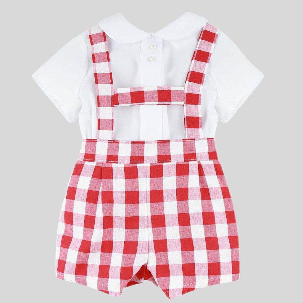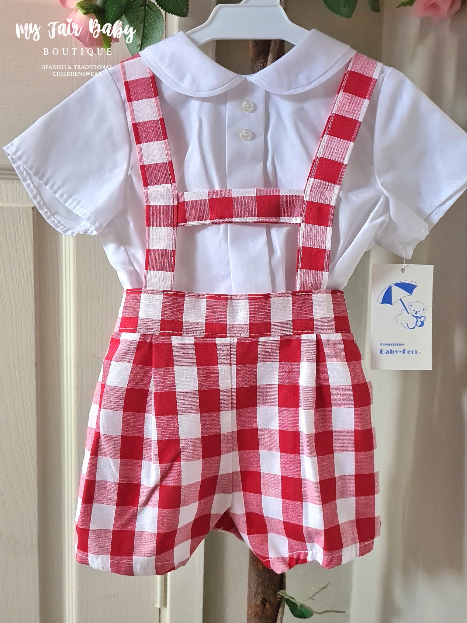 Spanish BabyFerr baby boys red check h-bar dungarees with a white short sleeved shirt. Matching baby boys and girls outfits available separately. Small on sizing.