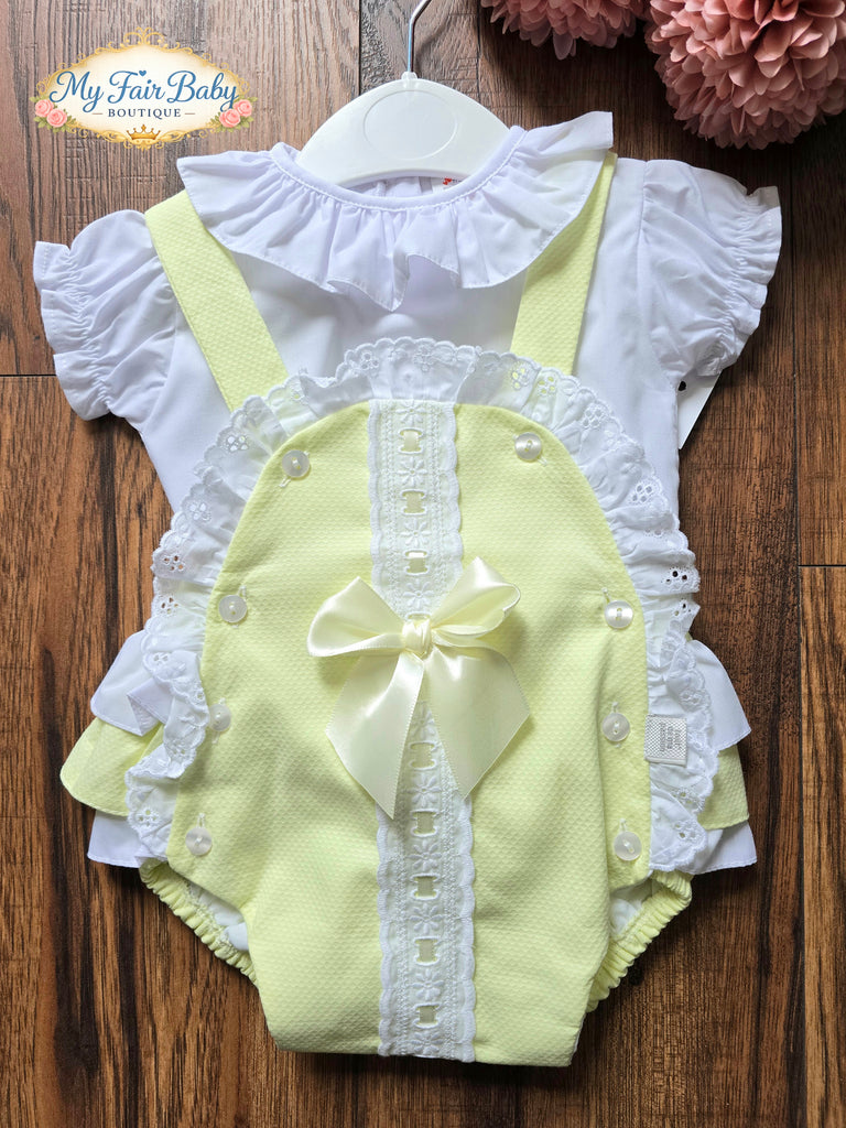 Spanish baby girls lemon waffle romper lace and bow romper. Comprising a lemon pique romper with ruffles and lace and bow detailing. Matched with a short sleeved cotton blouse. This outfit is 100% cotton.