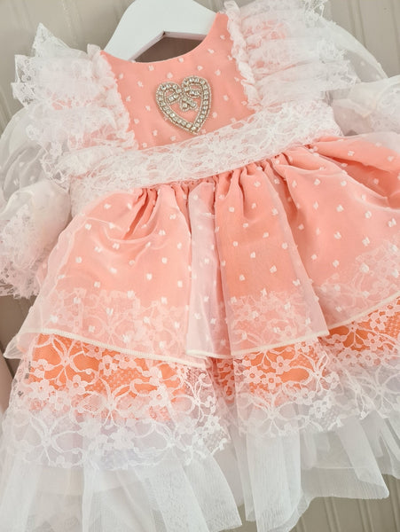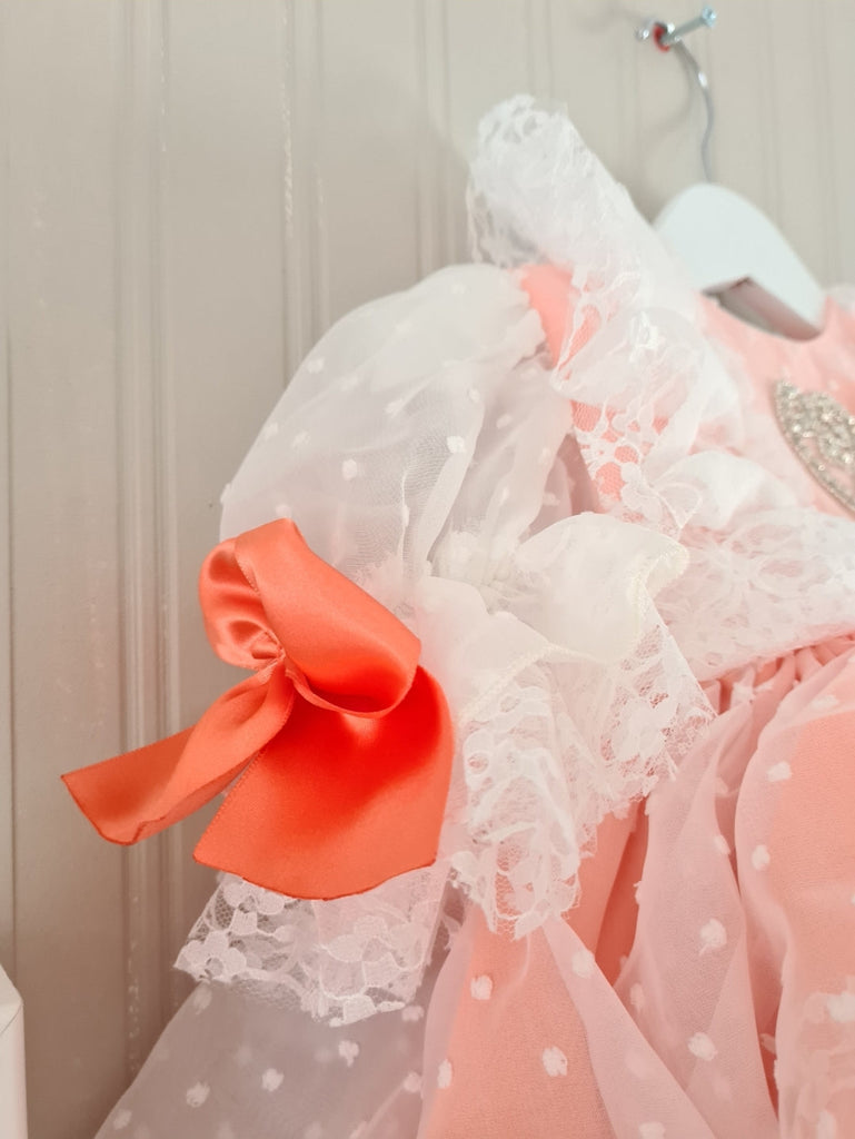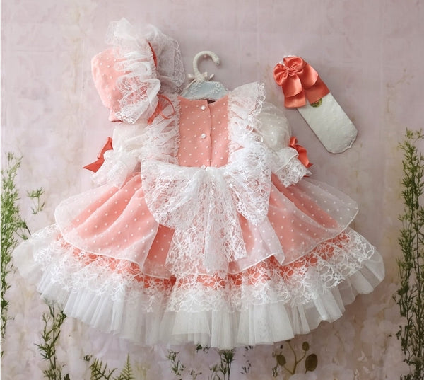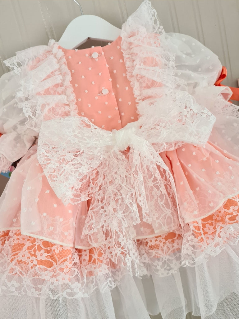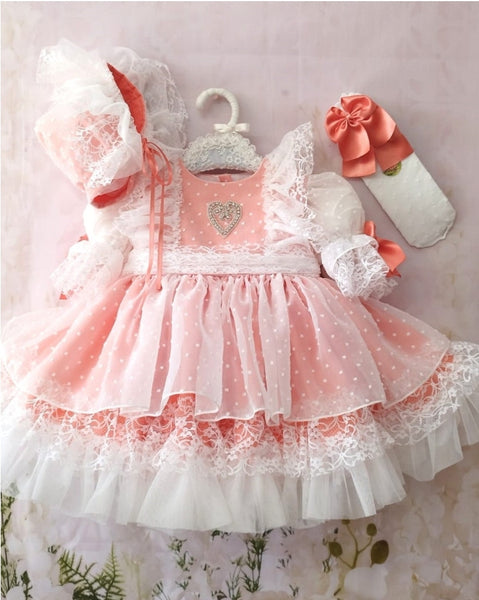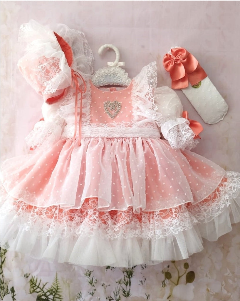 Sonata Infantil Spanish girls coral tulle puffball dress with lace trim and cute heart design to the chest. True to size fitting. Bonnet is not included. We have 1x 18 month size in stock ready to ship immediately.