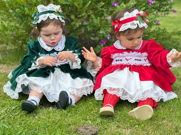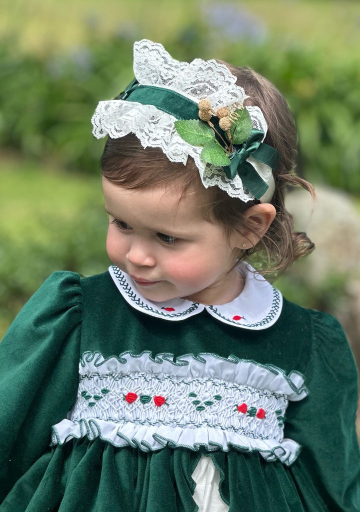 Sonata Infantil Spanish girls green puffball dress with chest smocking. True to size fitting. Headband is not included, but is available to order seperately. This item is made to order and takes approximately 8 weeks to arrive from the order date (if you need the item sooner please message us to discuss this)