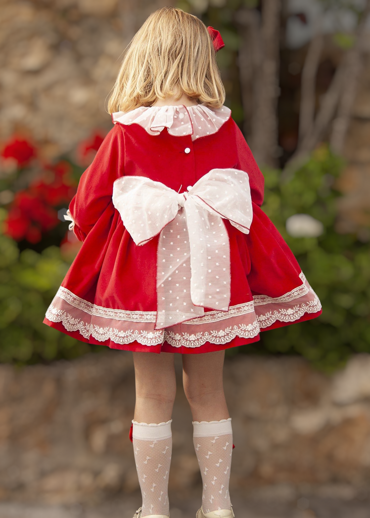 Beautiful Spanish girls red smocked puffball dress with lace trim and a large back bow by Sonata Infantil. In stock available for immediate dispatch.