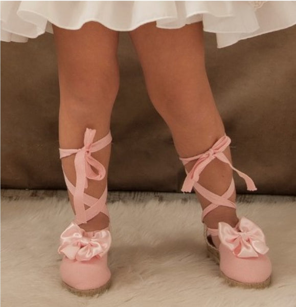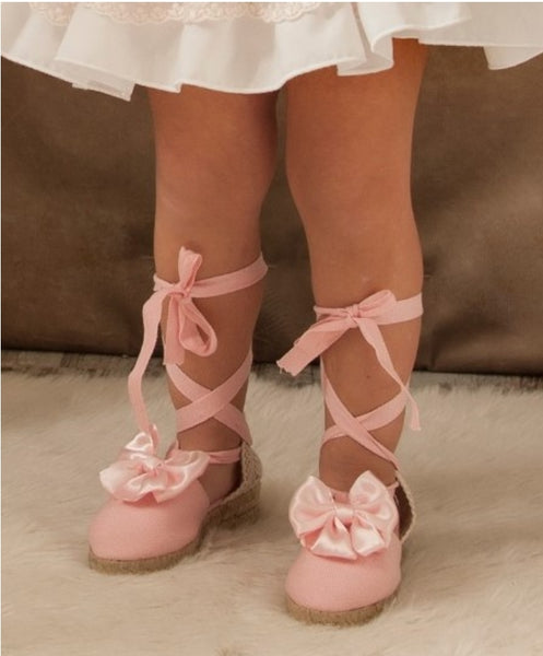 Sonata Infantil Spanish girls summer canvas shoes with large silk bows and ribbon fastening. Sizes 18-23 are flat soled without the wedge These shoes are made to order and take approximately 6-8 weeks to arrive. Matching dresses and bonnets are all available separately.