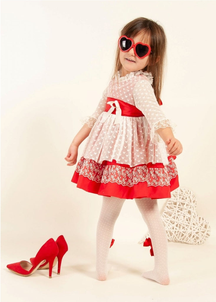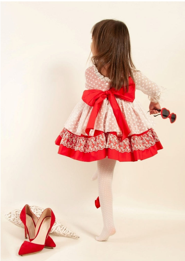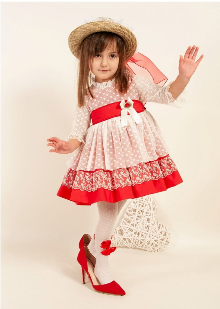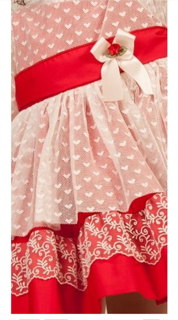 Sonata Infantil Spanish girls red tulle heart dress. True to size fitting. This item is made to order and takes approximately 8 weeks to arrive from the order date. Kindly note items which are 'made to order' are exempt from a return as they are ordered in by customer request. If you need measurements, please contact us before ordering.
