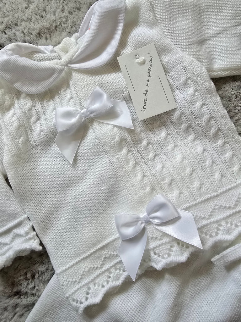 Spanish baby girls white knitted jumper with a pique collar and bow detailing. Matched with a pair of knitted trousers and a bonnet.