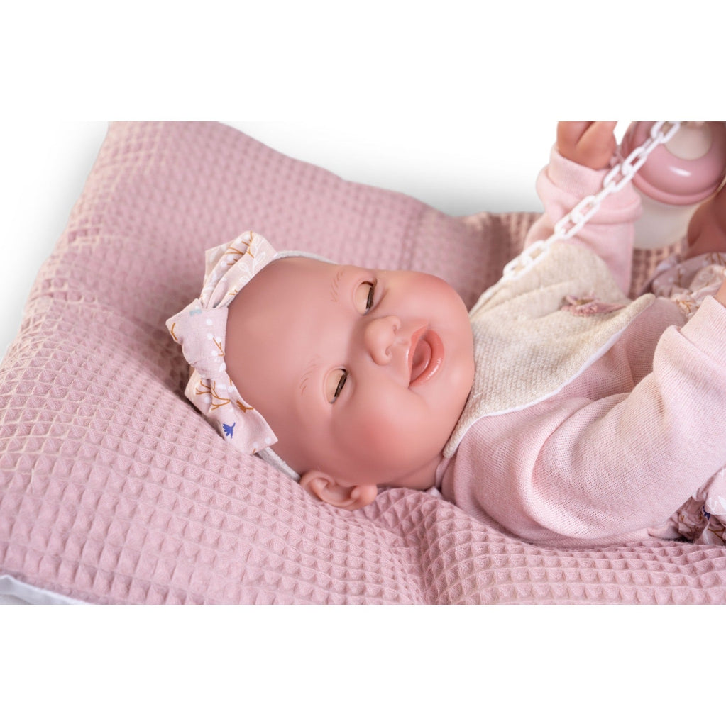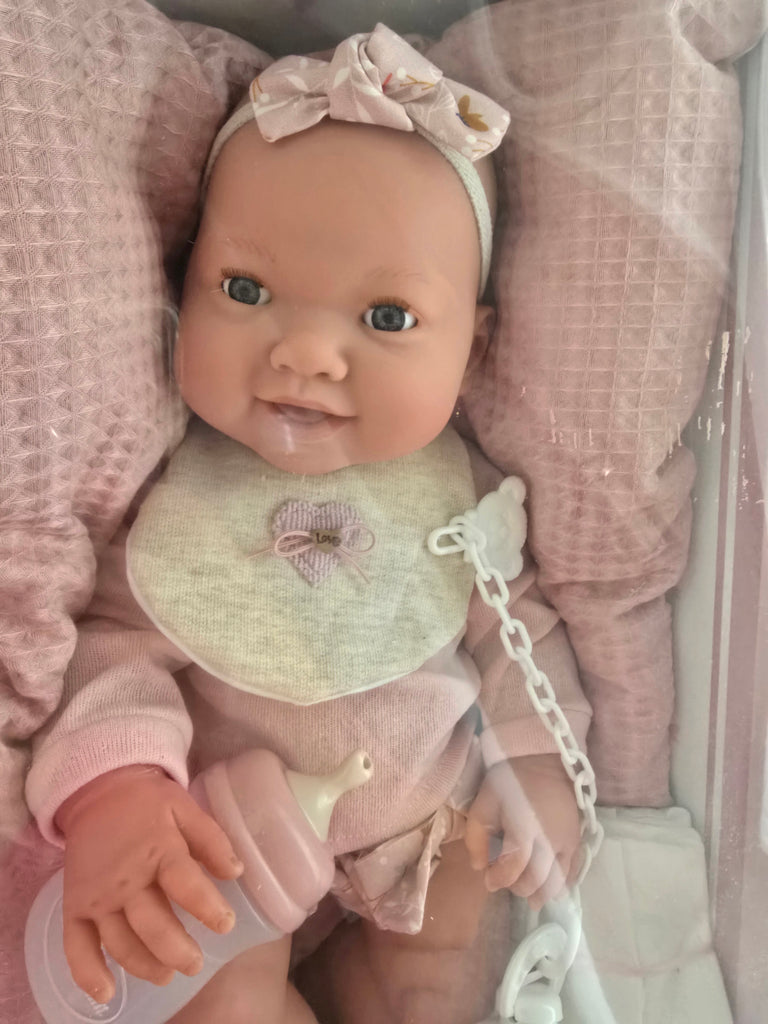 Mia Baby Girl doll by "Muñecas Antonio Juan" brings an interactive and educational dimension to traditional doll play. This beautiful 42cm doll has been designed to immerse children in the world of childcare in a realistic and educational way. Little ones can feed Mia with her bottle and then change her diaper when she wets, providing a fun play experience that realistically mimics the routine of caring for a real baby.
