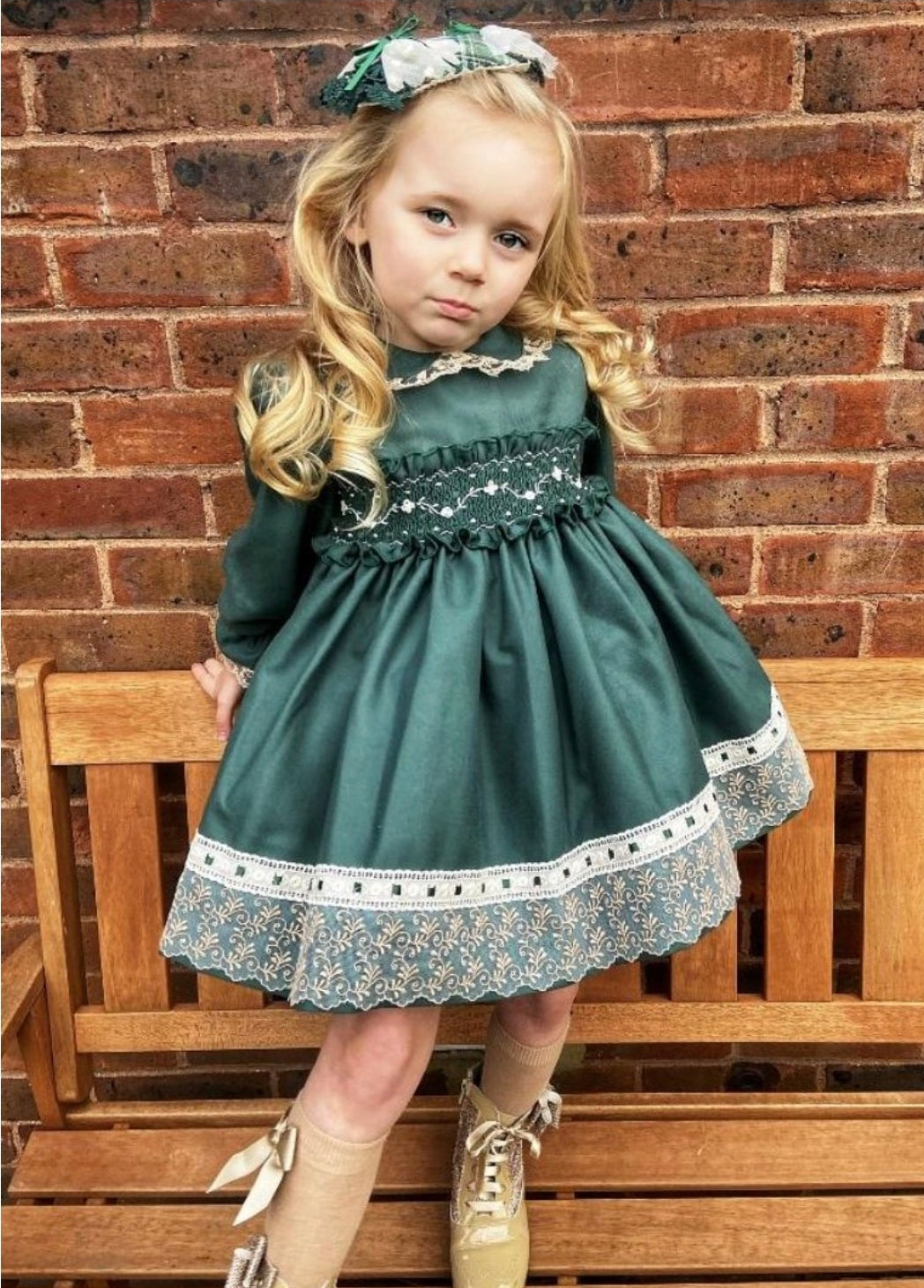 Sonata Infantil Spanish girls green smocked winter dress with chest embroidery. True to size fitting. The matching bonnet is available to order separately.  This item is made to order and takes approximately 8 weeks to arrive from the order date (if you need the item sooner please message us to discuss this)
