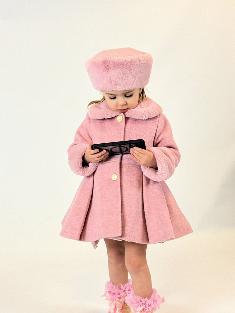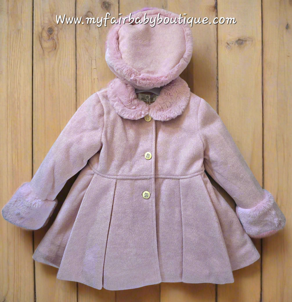 Beau kid traditional girls blush pink coat with faux fur trim, side pocket and a matching hat.