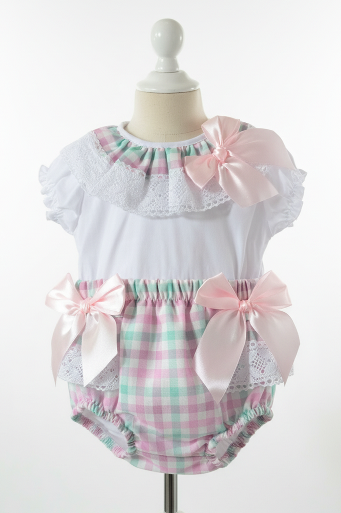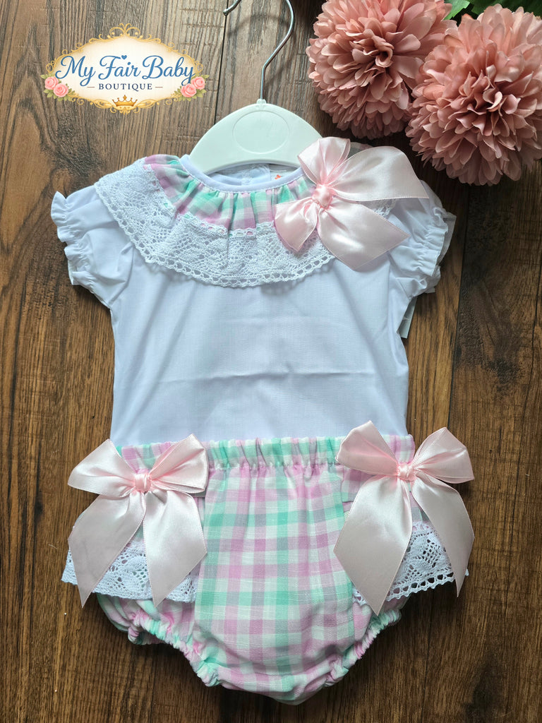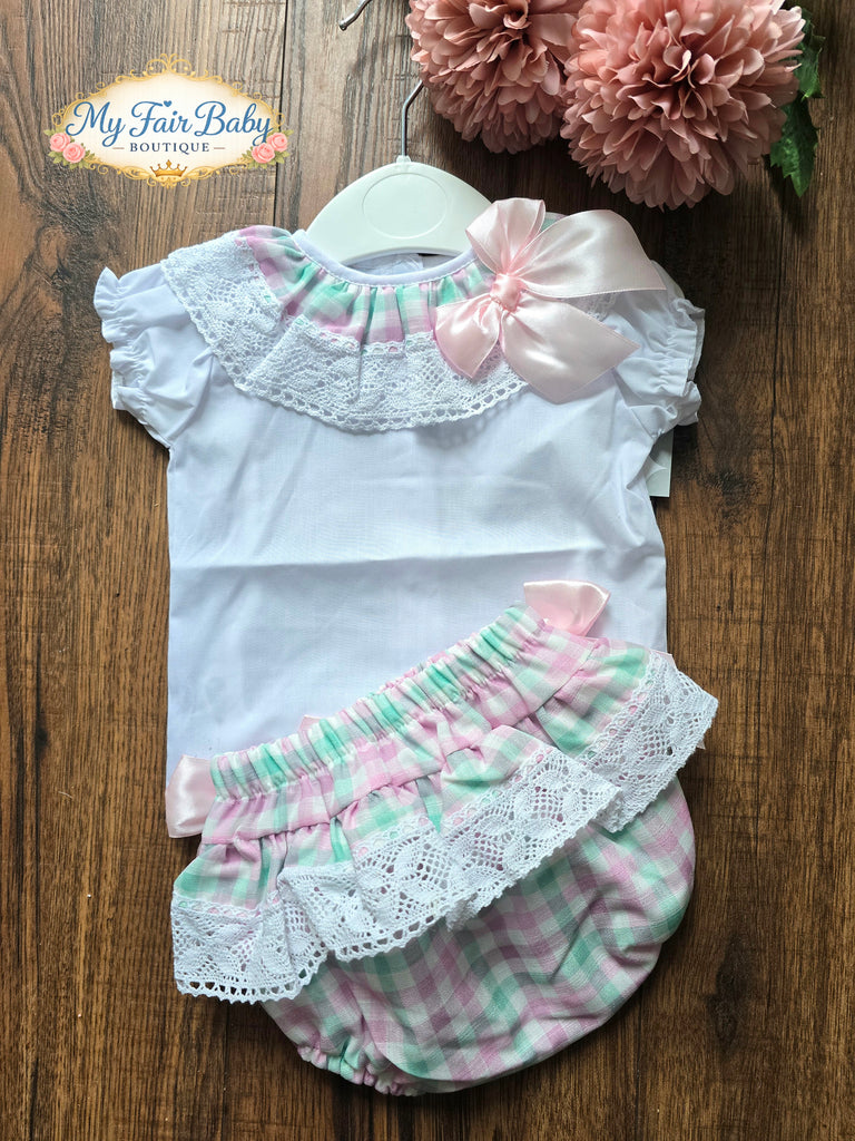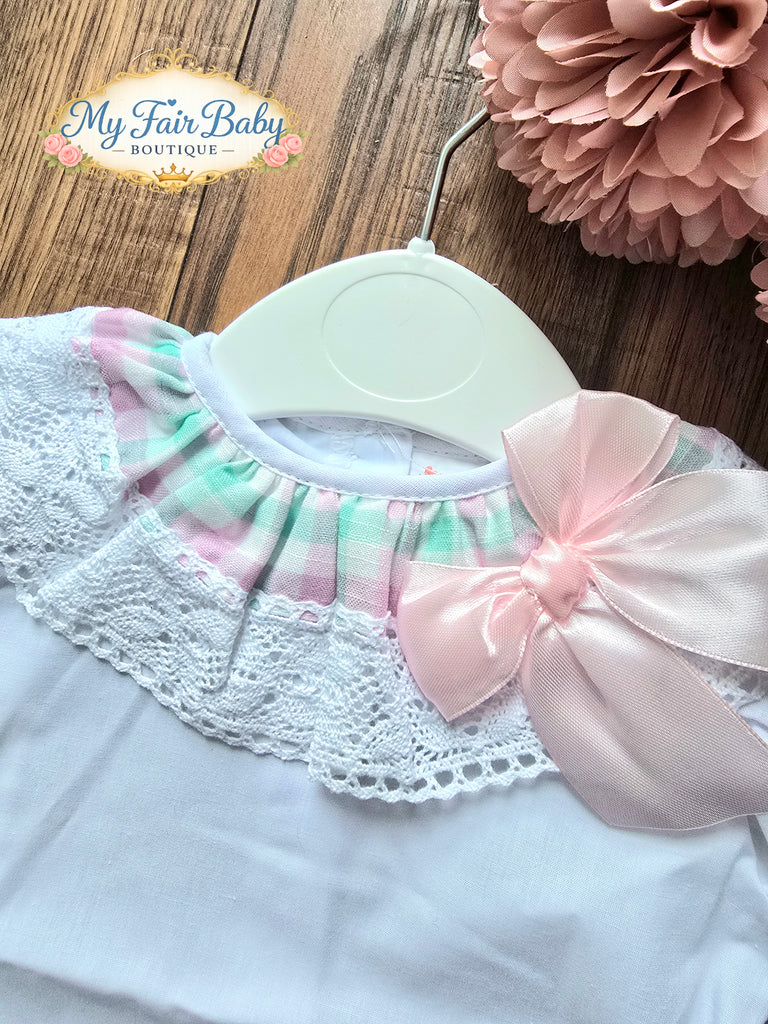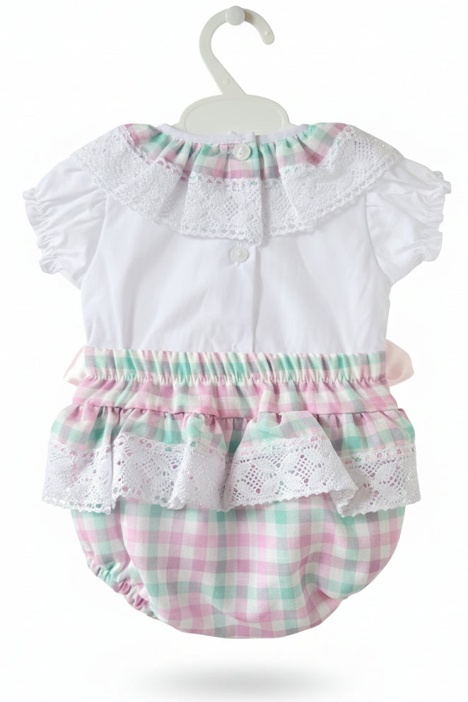 Spanish baby girls pink & green check jam pants with lace ruffles and bows to the front. Matched with a white short sleeved blouse with coordinating collar. (This green is a different shade to the boys mint green waffle shorts set - EL217, so therefore will not match)