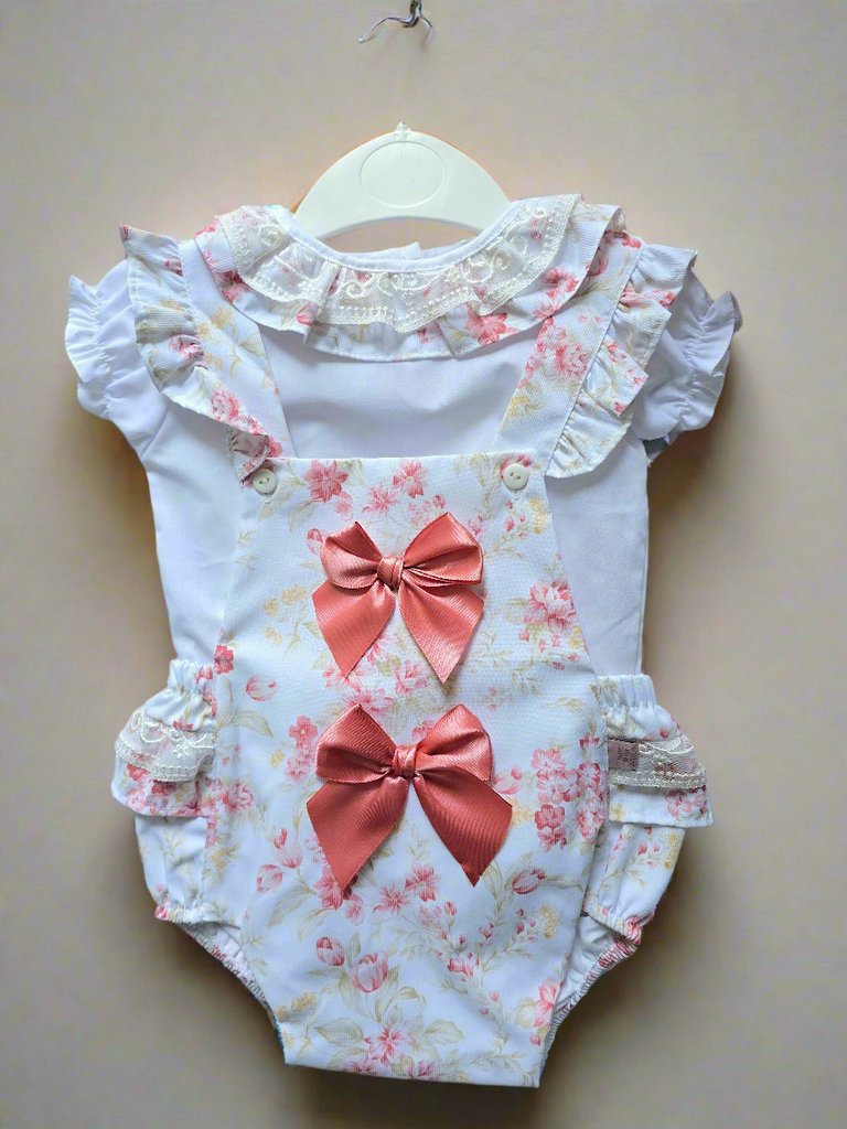 Spanish baby girls white and pink floral romper set. Comprising of a beautiful white romper with a pink floral design, trimmed with ruffles, lace and satin bows. Matched with a white short sleeved blouse, with a coordinating collar. This outfit is 100% cotton.