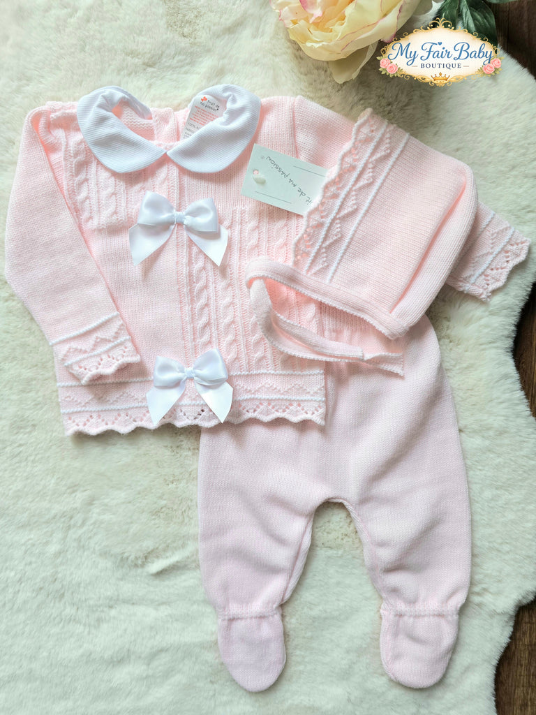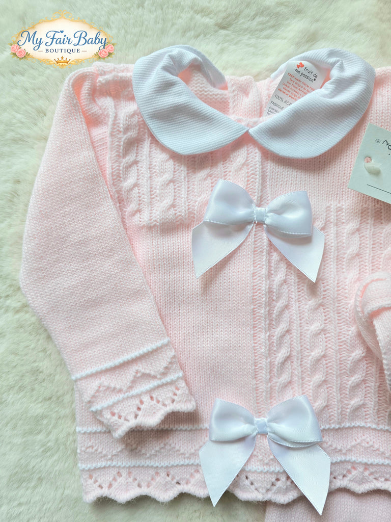 Spanish baby girls pink knitted jumper with a pique collar, cable stitch design and an open stitch hem, finished with two white bows. Matched with a pair of knitted trousers and a bonnet.