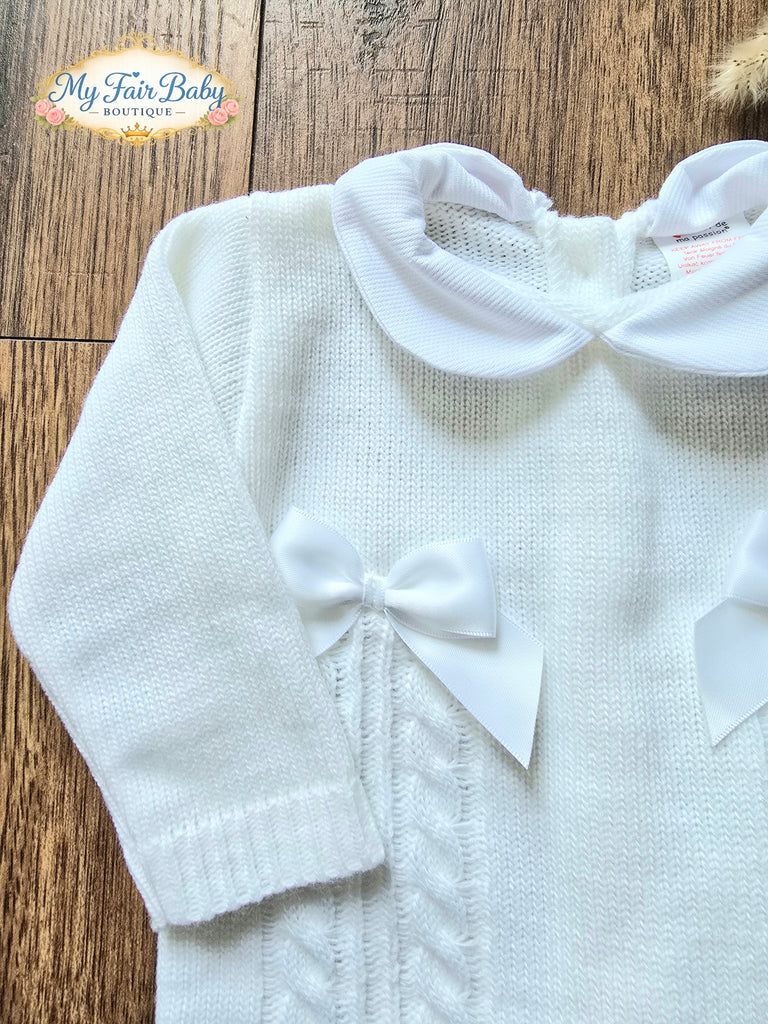 Spanish unisex baby girls/boys white knitted jumper with a pique collar, cable stitch detailing and double chest bows. Matched with a pair of knitted trousers and a hat.