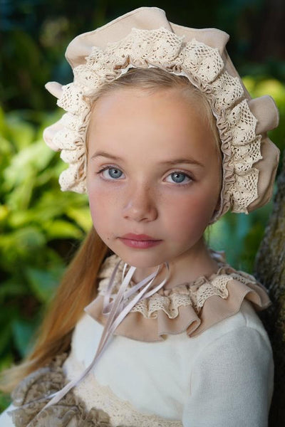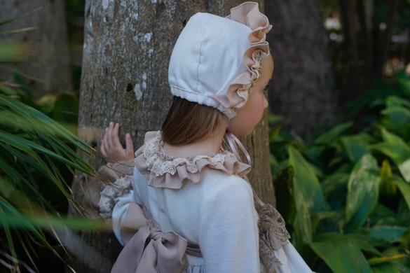 Ela Confeccion Spanish girls cream puffball dress with matching pants and bonnet. This product is made to order and takes approximately 6-8 weeks to arrive from the order date.