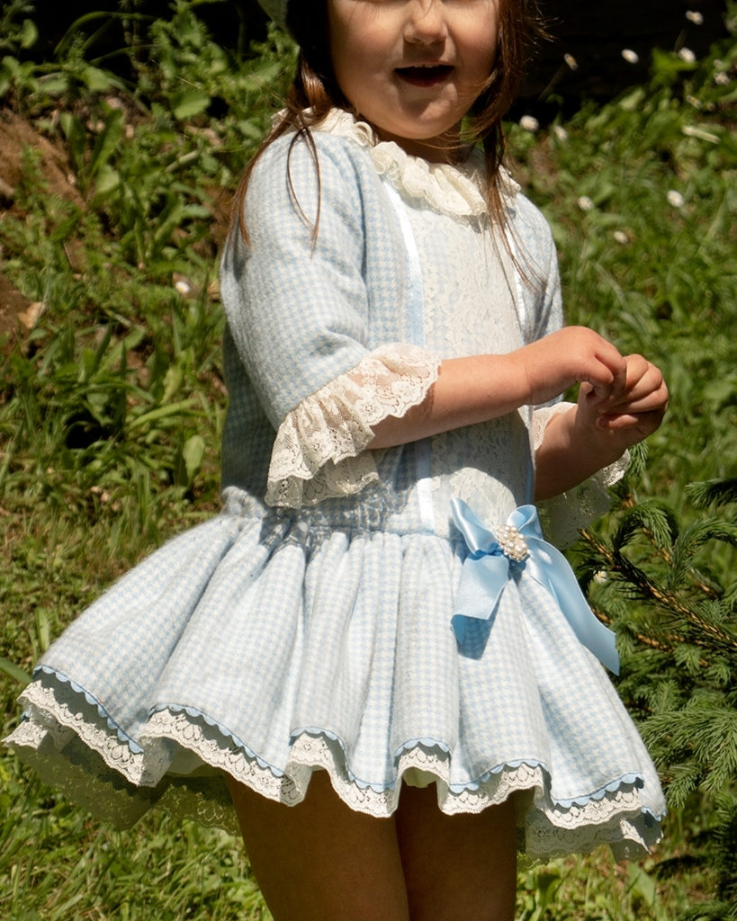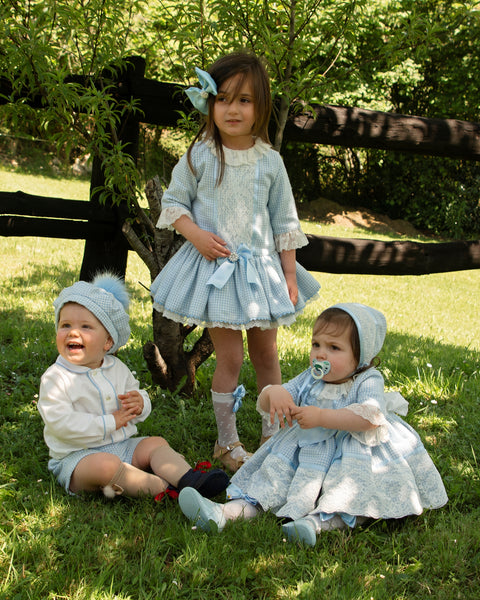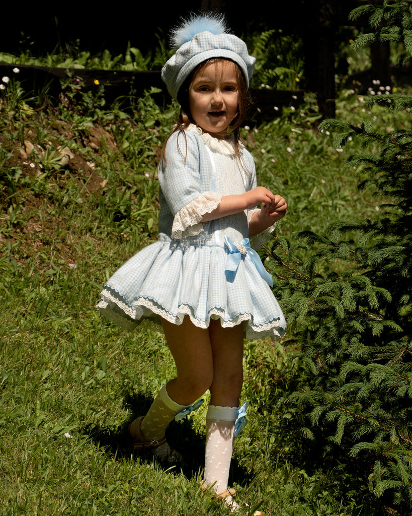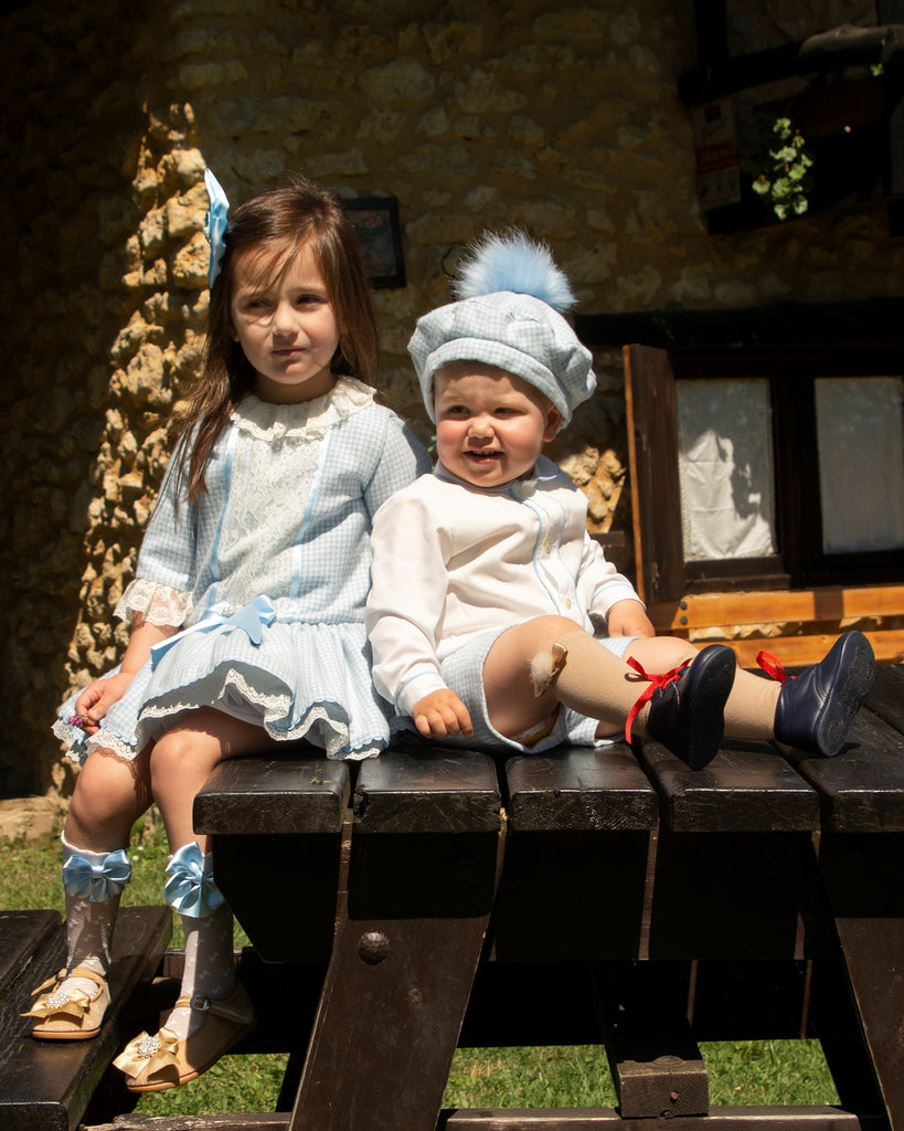 Sonata Infantil Spanish girls blue check dropwaist dress. Matching beret isn't included but is available to order here and matching socks are available here. This item is made to order and takes approximately 8 weeks to arrive from the order date (if you need the item sooner please message us to discuss this) Also available is a matching boys set here and a matching lace baby dress here
