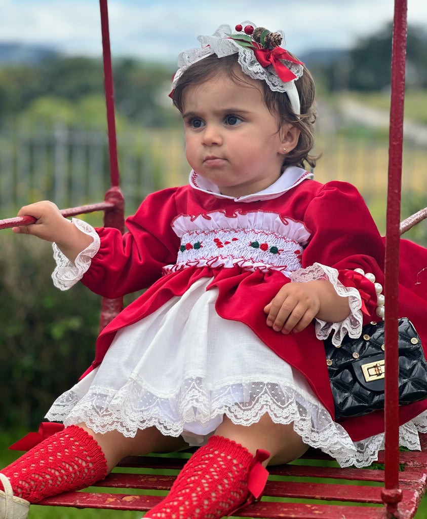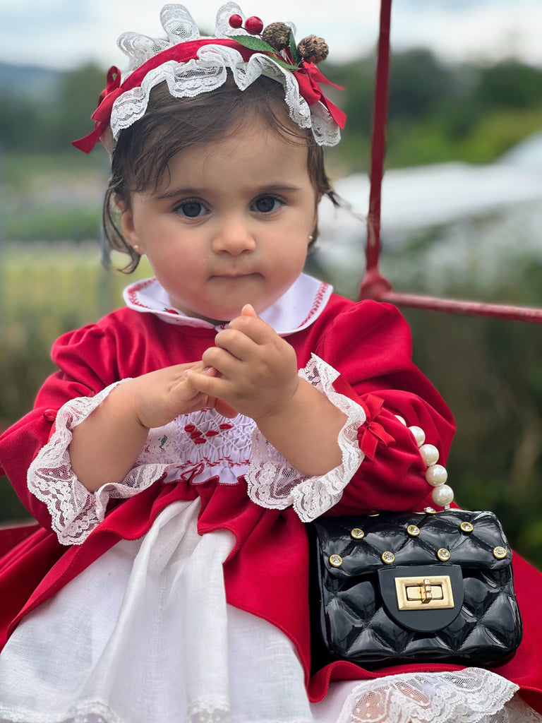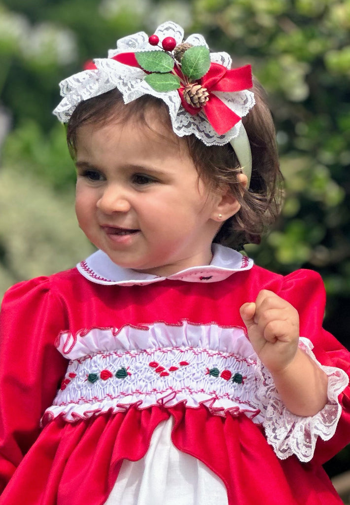 Sonata Infantil Spanish girls red puffball dress with chest smocking. True to size fitting. Headband is not included, but is available to order seperately. This item is made to order and takes approximately 8 weeks to arrive from the order date (if you need the item sooner please message us to discuss this)