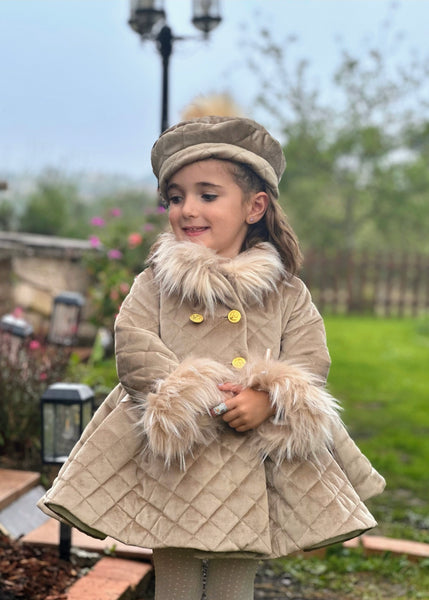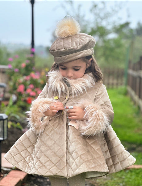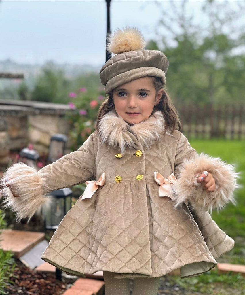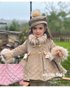 Sonata Infantil AW25 Spanish Girls Camel/Pink Velvet Fur Trimmed Winter Coat IN2517 - MADE TO ORDER